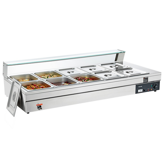 VEVOR 10-Pan Commercial Food Warmer, 10 x 12QT Electric Steam Table with Tempered Glass Cover, 1800W Countertop Stainless Steel Buffet Bain Marie 86-185°F Temp Control for Catering, Restaurant, Silver