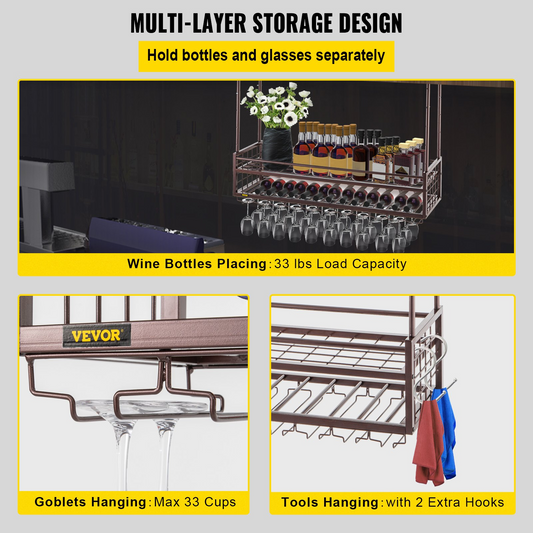 VEVOR Ceiling Wine Glass Rack, 46.9 x 13 inch Hanging Wine Glass Rack, 18.9-35.8 inch Height Adjustable Hanging Wine Rack Cabinet, Coppery Wall-Mounted Wine Glass Rack Perfect for Bar Cafe Kitchen