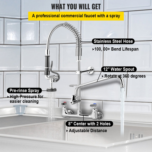 VEVOR Commercial Faucet Pre-Rinse with Sprayer, 8" Adjustable Center Wall Mount Kitchen Faucet with 12" Swivel Spout, 36" Height Compartment Sink Faucet for Industrial Restaurant, Lead-Free Brass