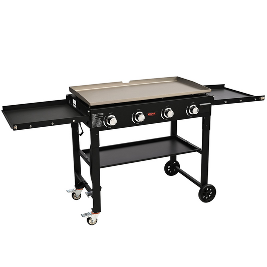 VEVOR Commercial Griddle on Cart, 36" Heavy Duty Manual Flat Top Griddle, Outdoor Cooking Station with Side Shelves, Steel LPG Gas Griddle, 4-Burners Restaurant Portable Grill - 60,000 BTU