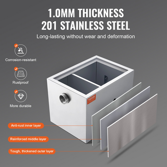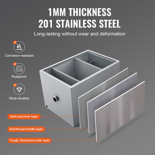 VEVOR Commercial Grease Trap, 40 LBS Grease Interceptor, Side Inlet Interceptor, Under Sink Stainless Steel Grease Trap, 10 GPM Waste Water Oil-water Separator, for Restaurant Canteen Home Kitchen