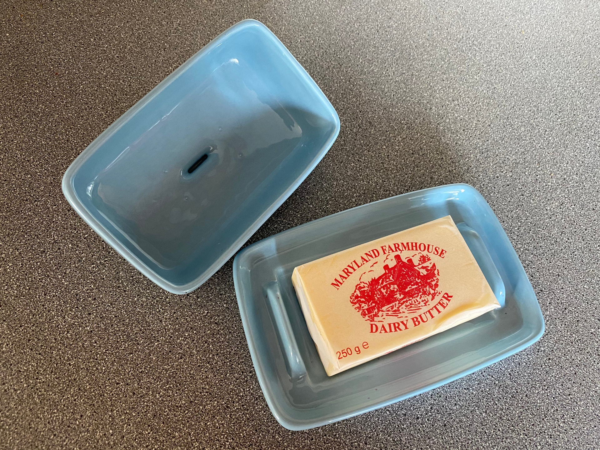 The butter dish holds an 8 oz. or 250g block of butter or two American style butter sticks. Butter dish measures 190mm (7.5 inches) Long, 125mm (5 inches) Wide, 80mm (3 inches) High.