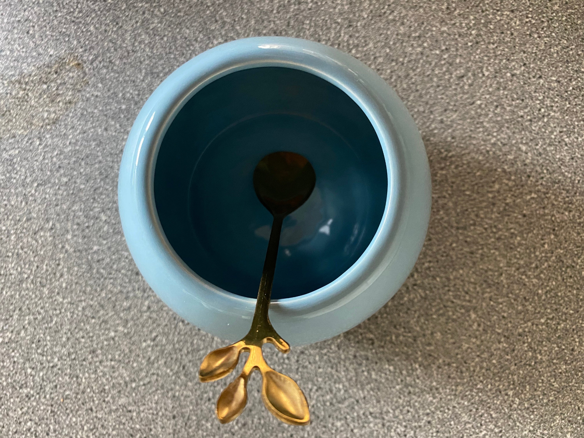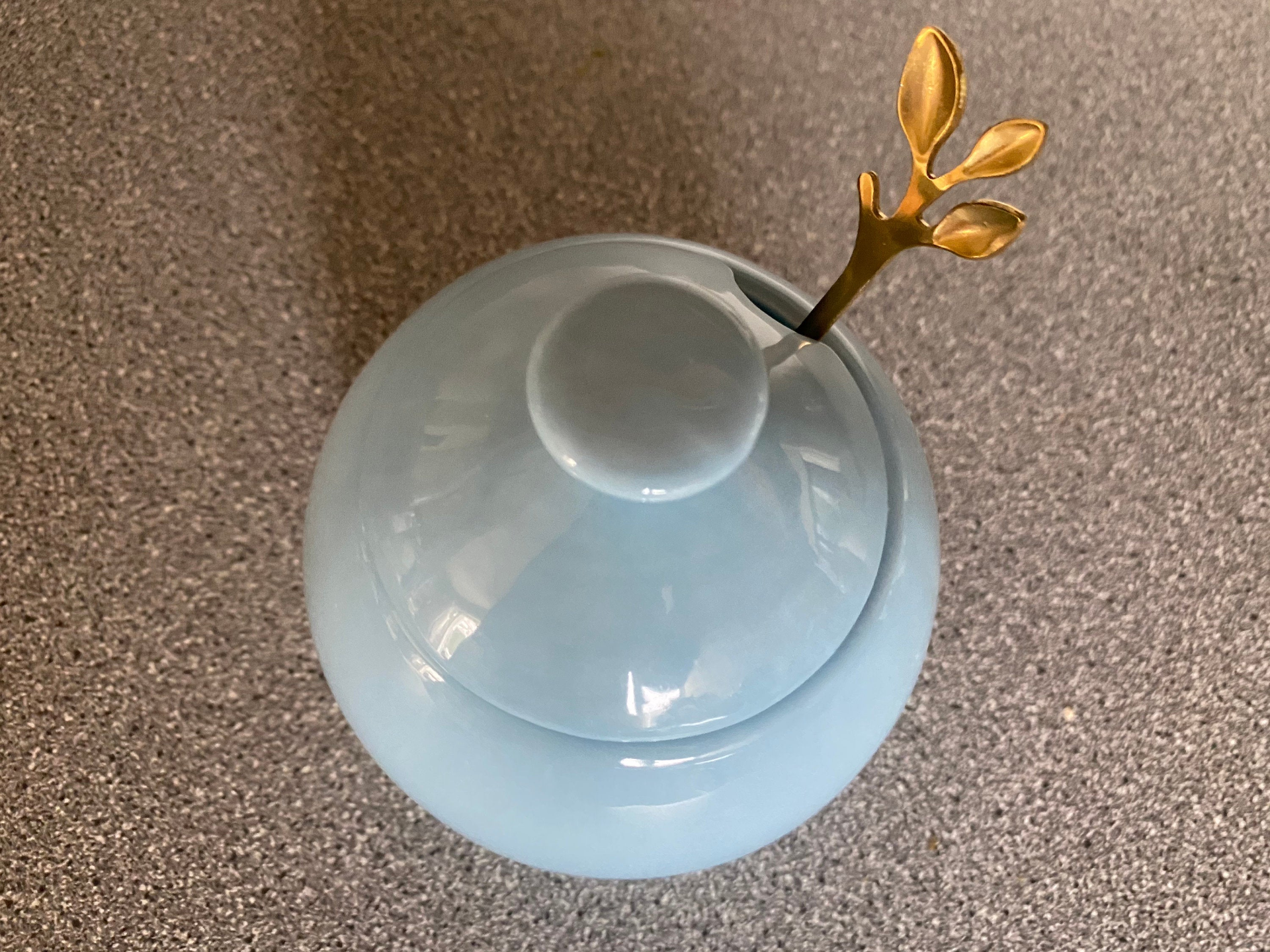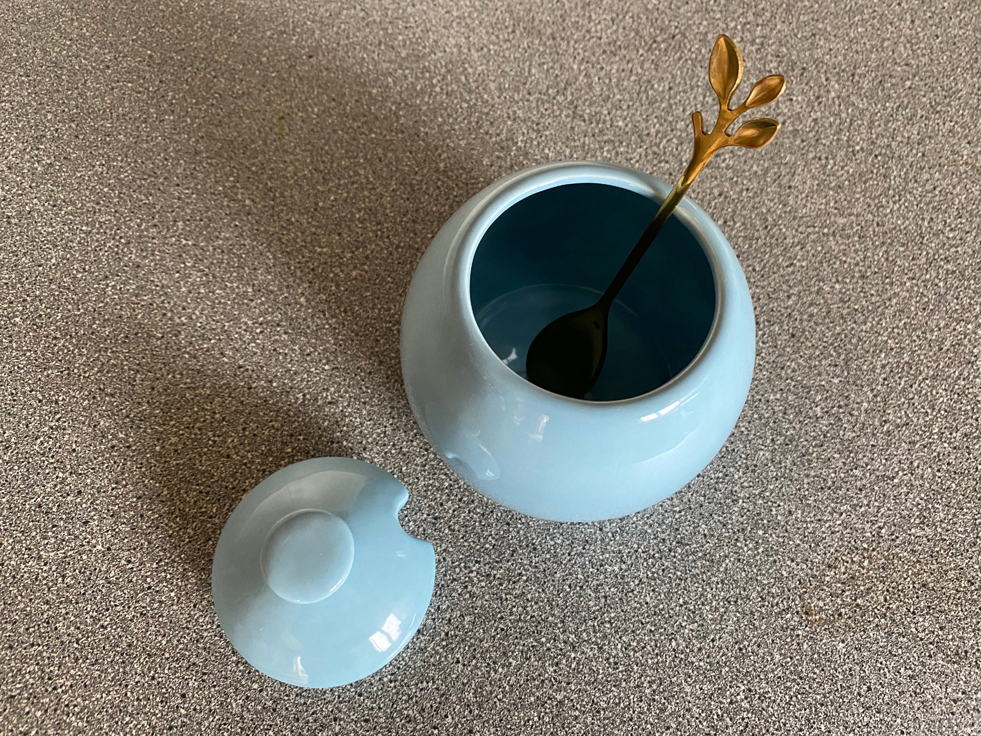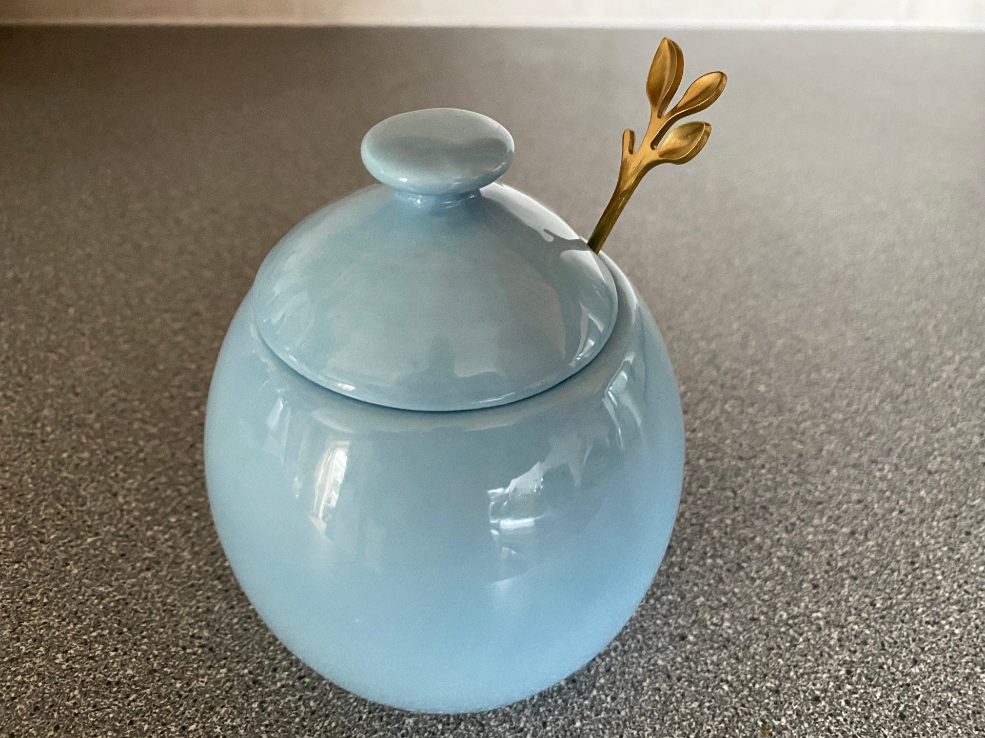 Ceramic butter dish with lid in a glossy Powder Blue Glaze with matching sugar bowl, jam pot is ideal for keeping butter fresh and spreadable.