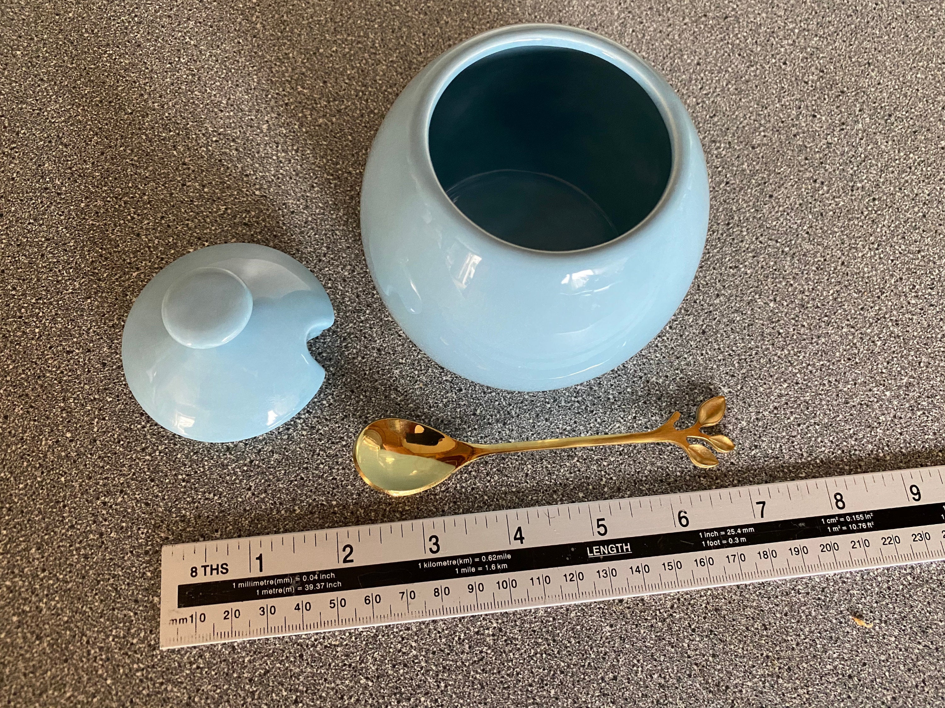 Each sugar bowl/jam pot and lid measures 110mm high (4 inches) and 90mm in diameter (3.5 inches). The stainless steel spoon is 125mm (5 inches) long.