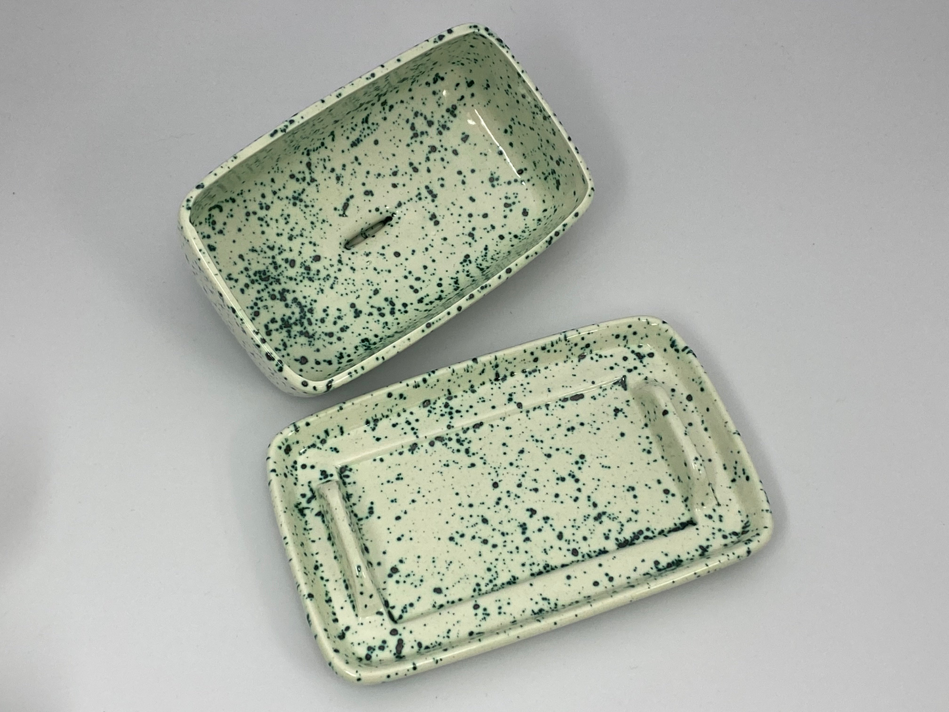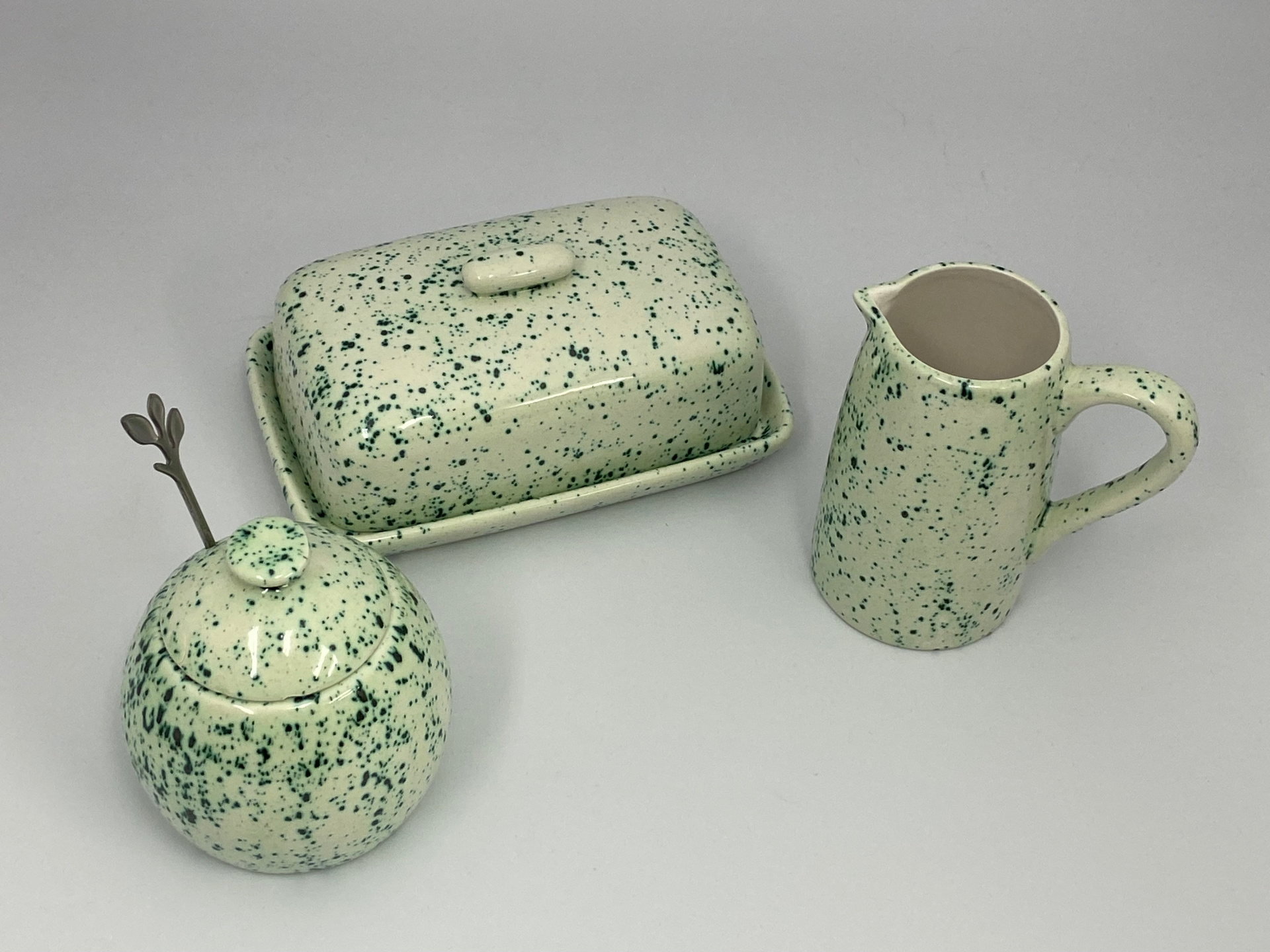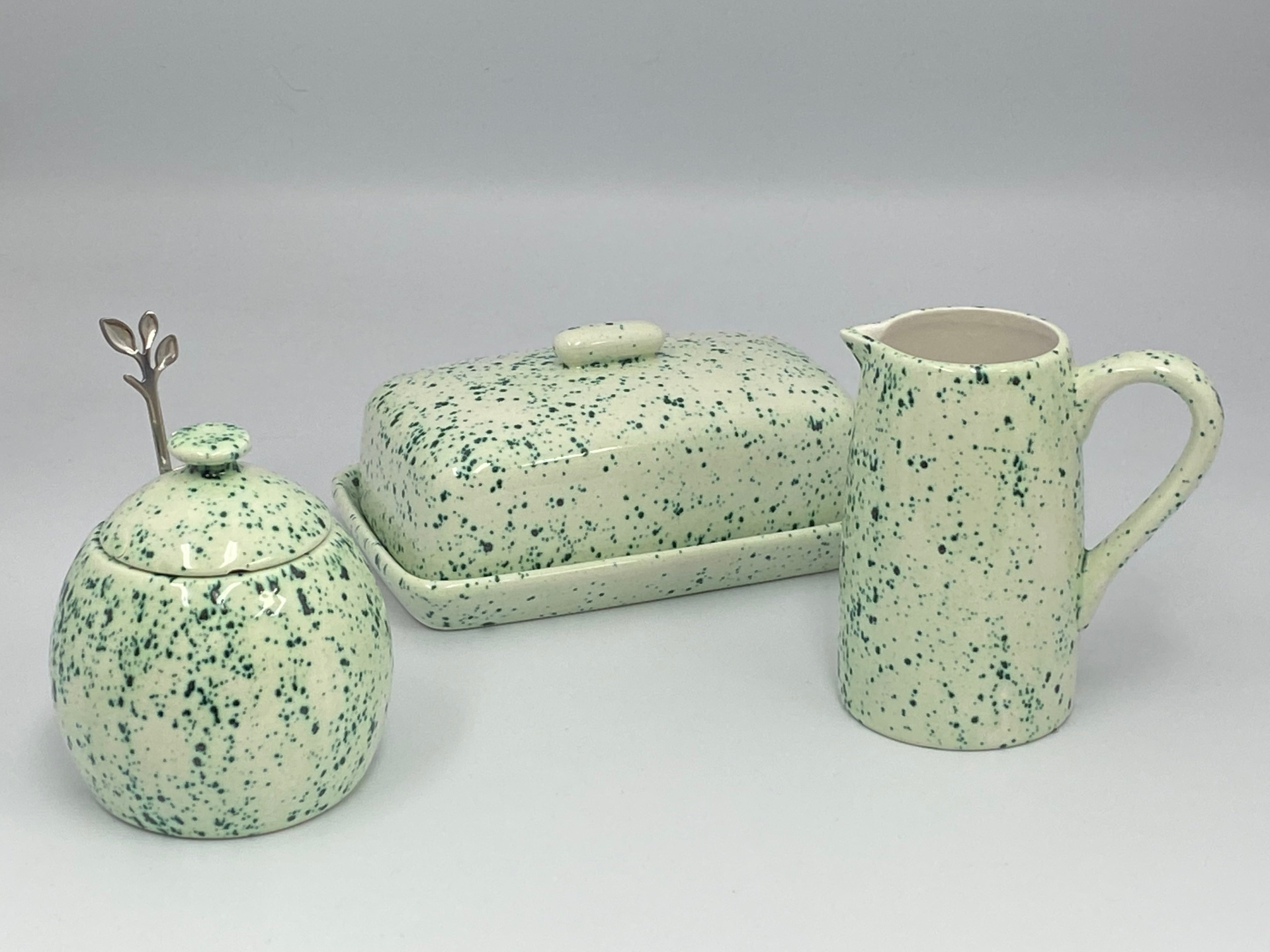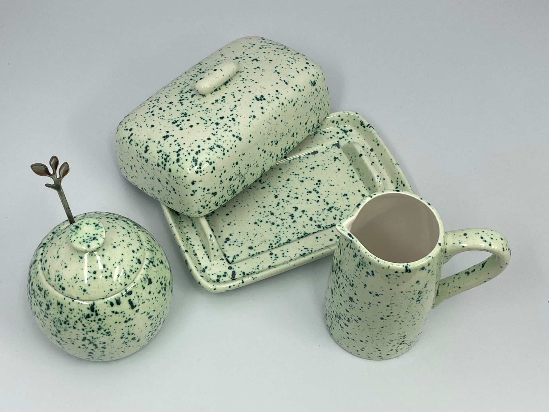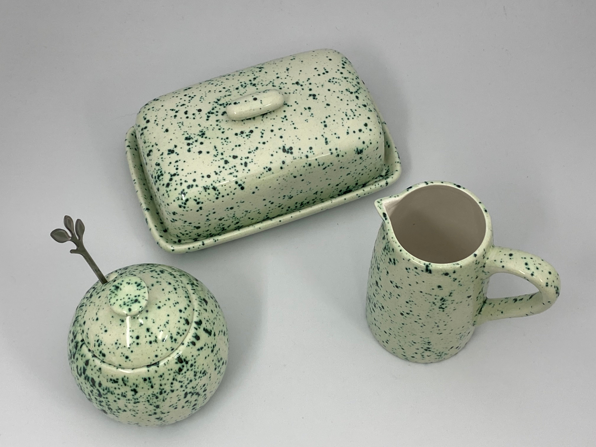 Butter Dish, Sugar Bowl, Milk Jug Set Speckled Green Glaze