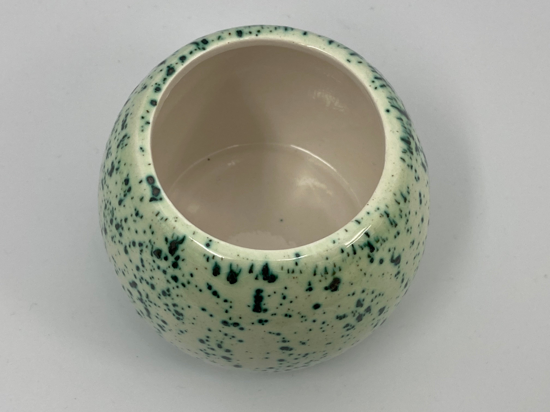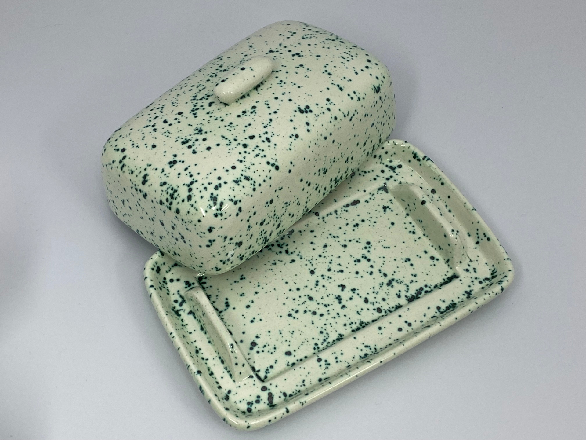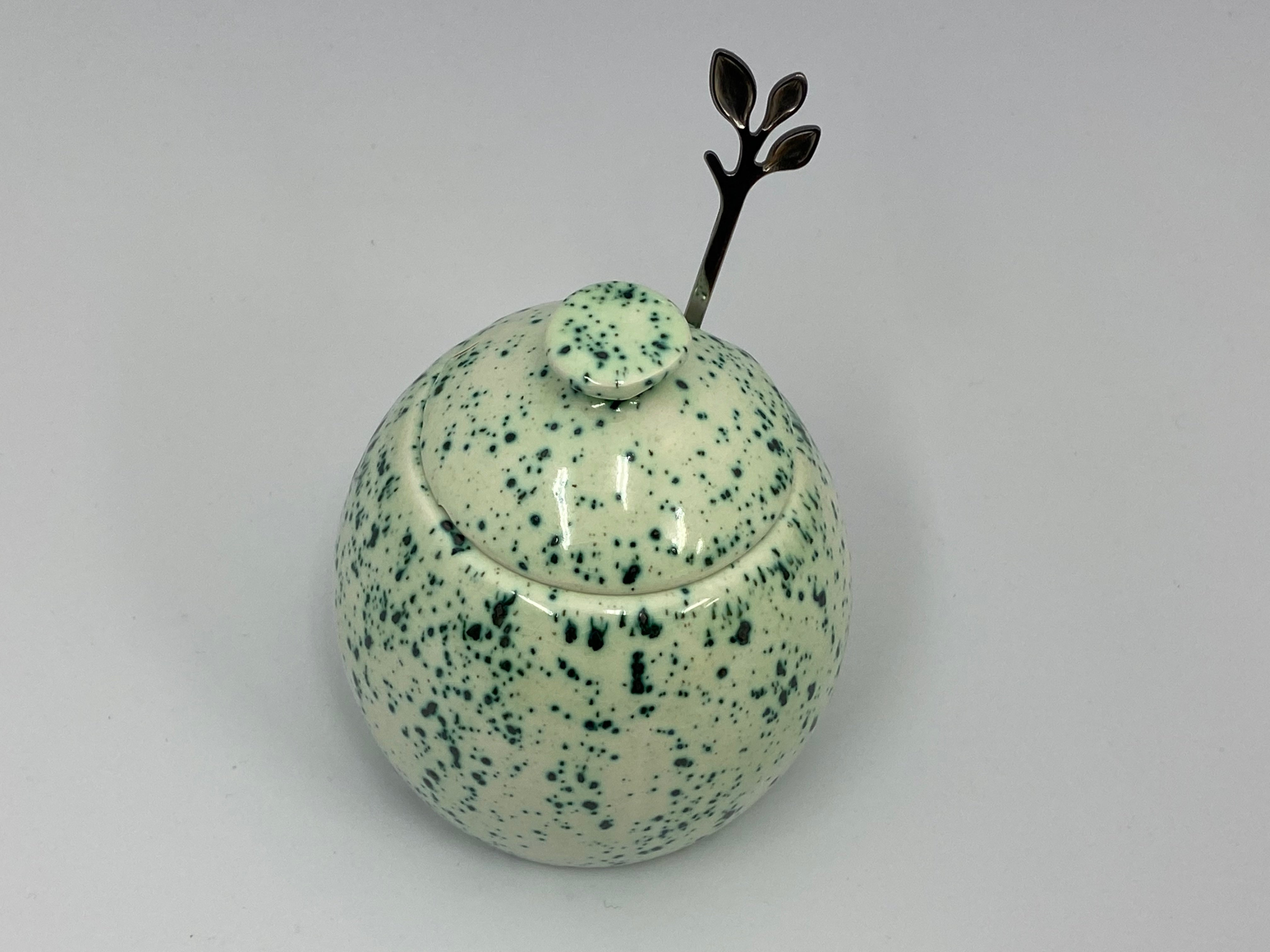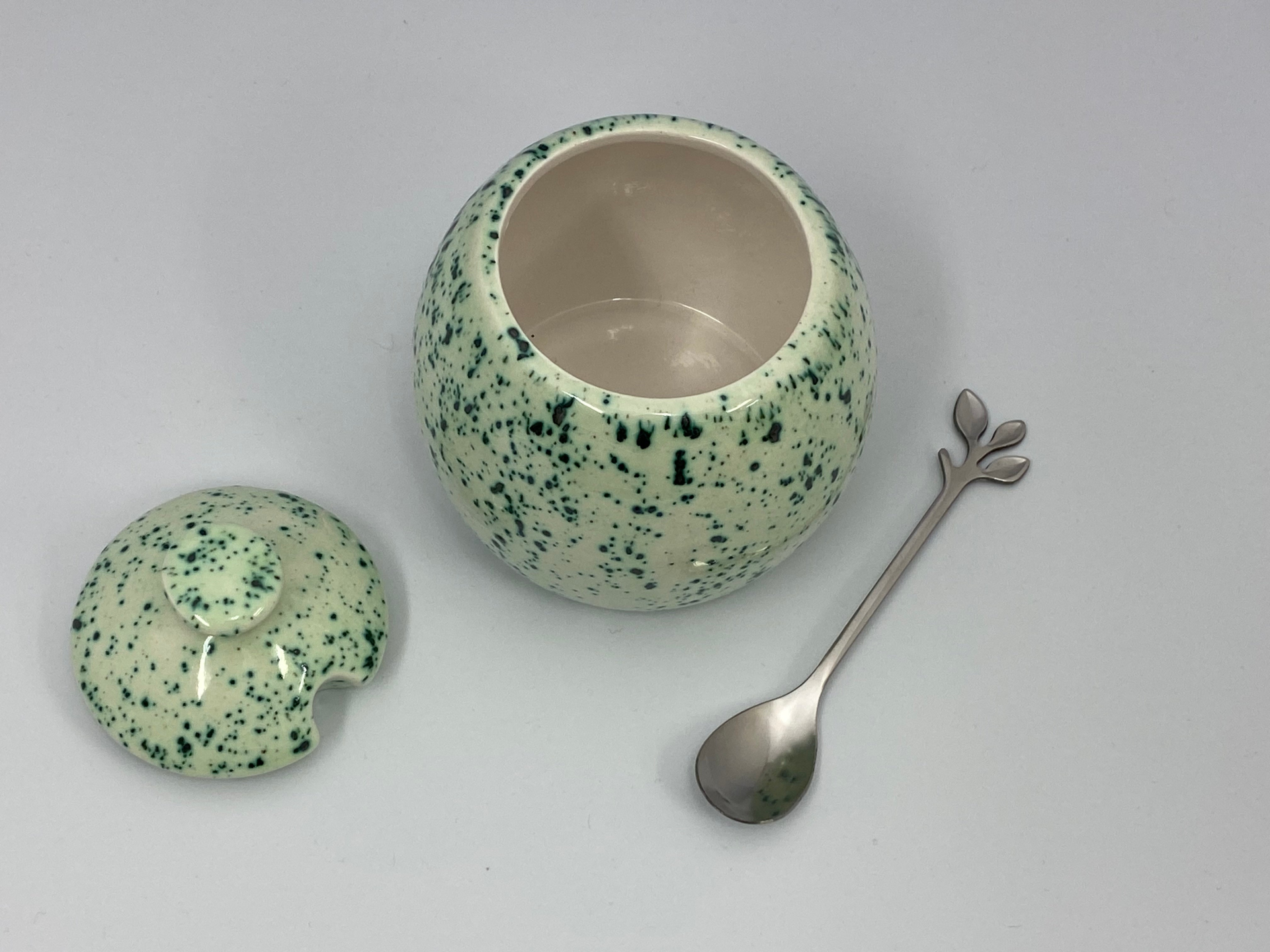 A lovely handmade butter dish with lid and matching sugar bowl with lid and a choice of a silver or gold leafy spoon finished with a speckled green glossy glaze outside and pure white inside.