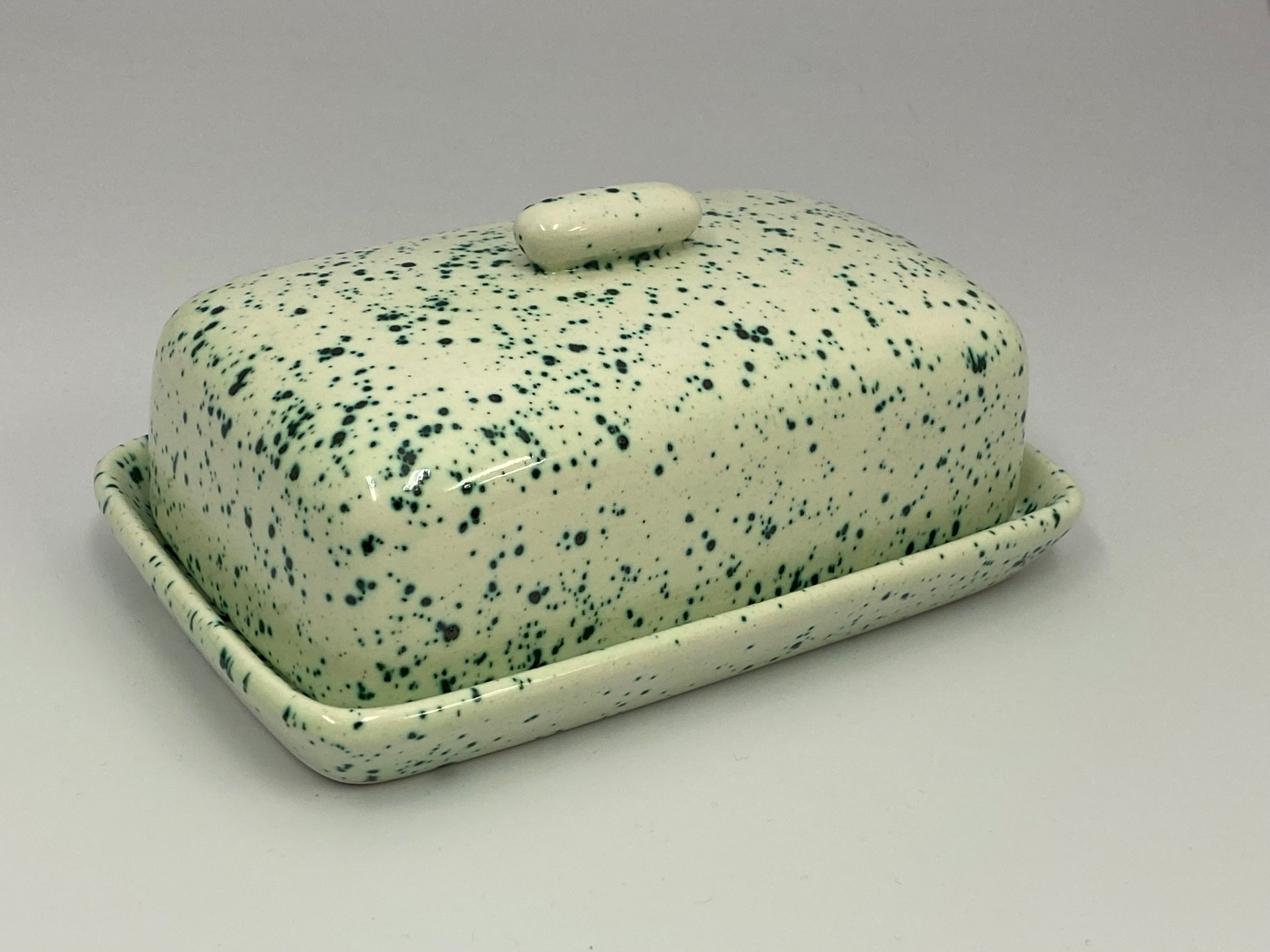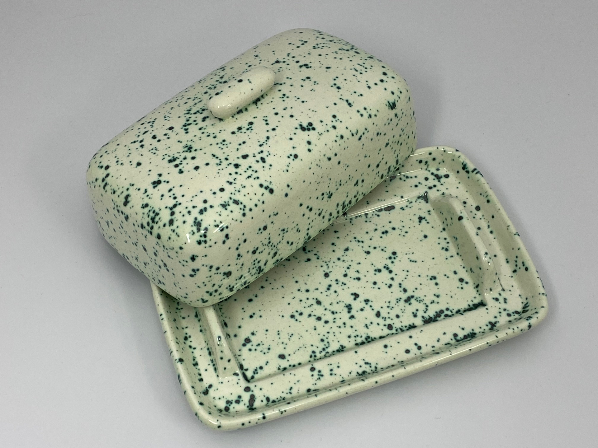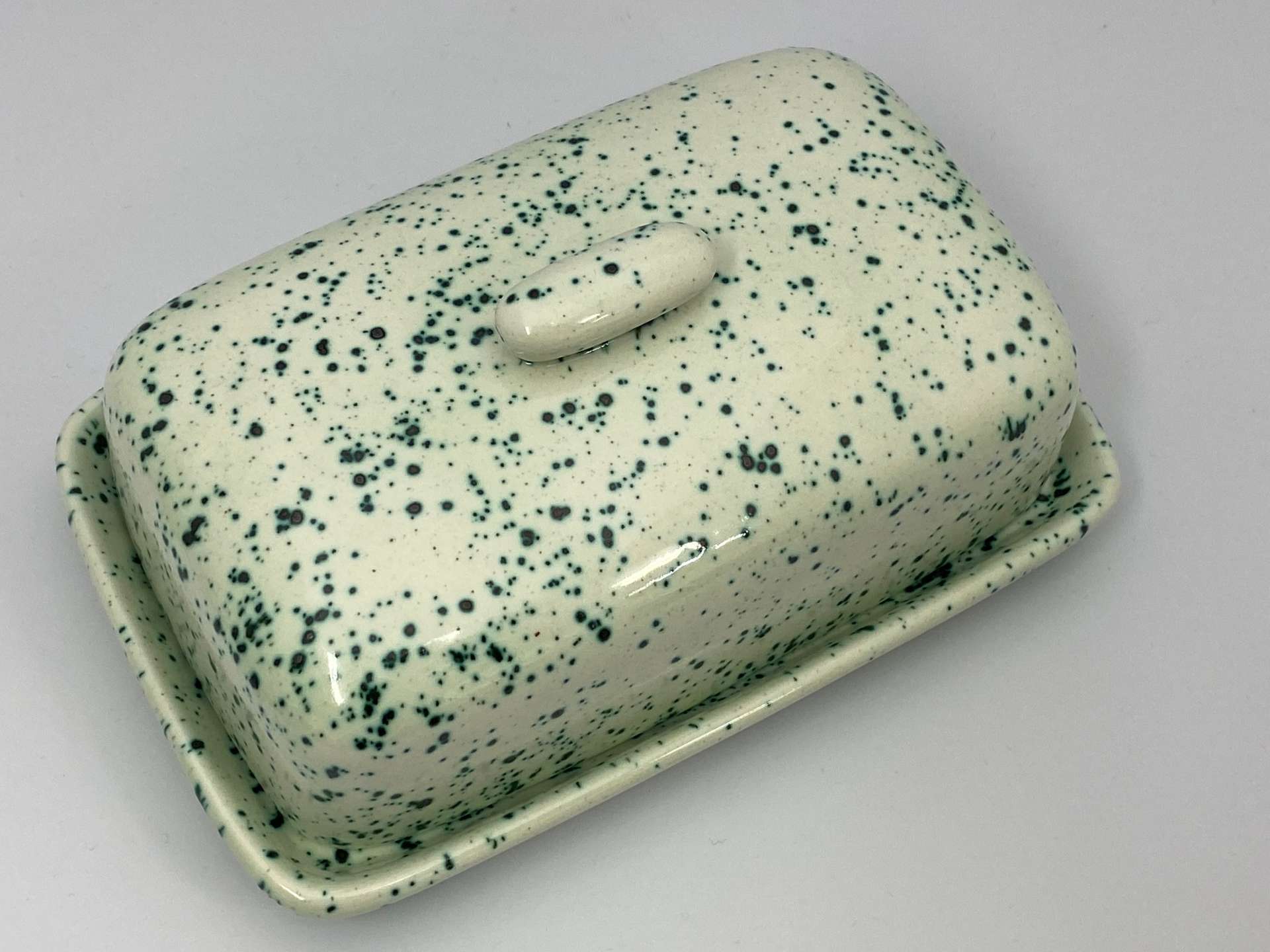Microwave and dishwasher safe earthenware pottery butter keeper keeps butter fresh and easily spreadable. Holds an 8 oz. or 250g block of butter or two American style butter sticks.