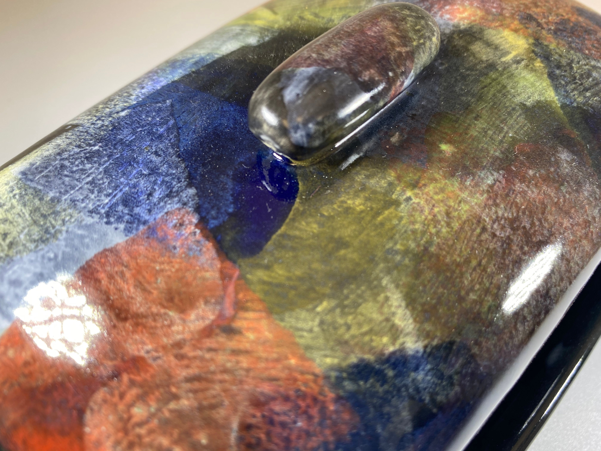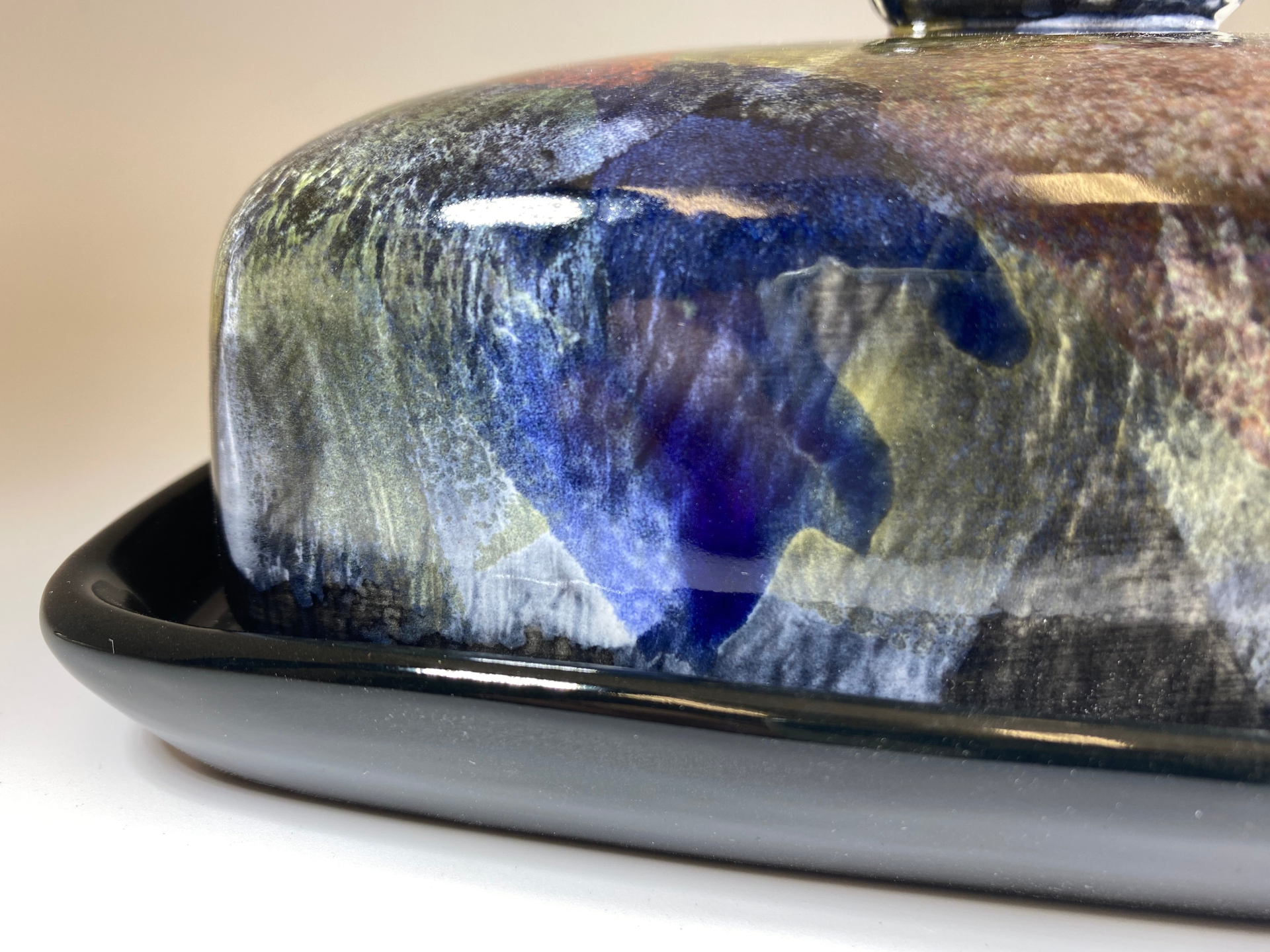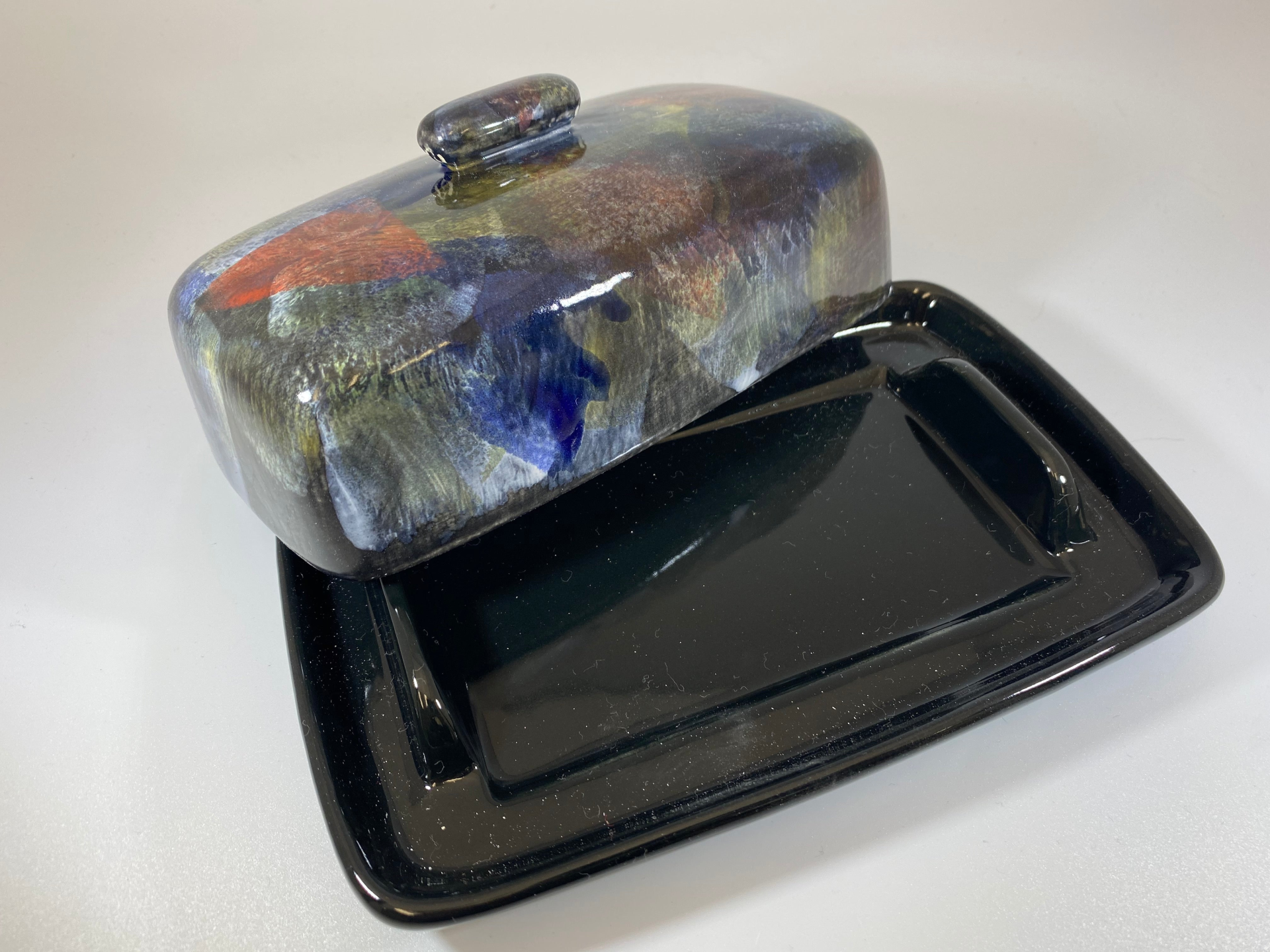 NEW Abstract Glaze Design for a uniquely different ceramic butter dish with lid is an earthenware pottery butter dish with a smooth surface lid in a random abstract glaze with a jet black glazed dish.