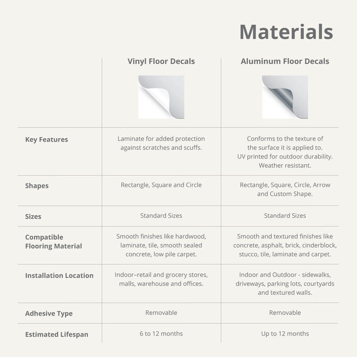 - Floor Graphics - Vinyl and Aluminum Floor Decals. Vinyl floor decals are suitable short-term interior applications and can withstand most common floor cleaning chemicals and methods. Printed on 4 mil. flexible vinyl. Aluminum floor decals are rated for outdoor use. Printed on 20 mil. rugged aluminum foil material.