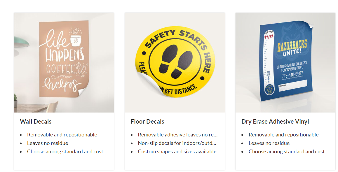 While the 4 kinds of custom printed decals use an assortment of different materials, each one is easy to apply and requires no extra adhesive.