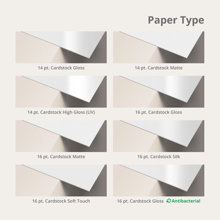 - Need a material that’s slightly thicker than the standard? The 16 pt. cardstock has a little more weight than the 14 pt. Its higher quality brings out the colors on vivid designs with a gloss or matte finish. For a more premium finish, choose silk, or soft touch. You may even opt for cardstock with antibacterial coating.