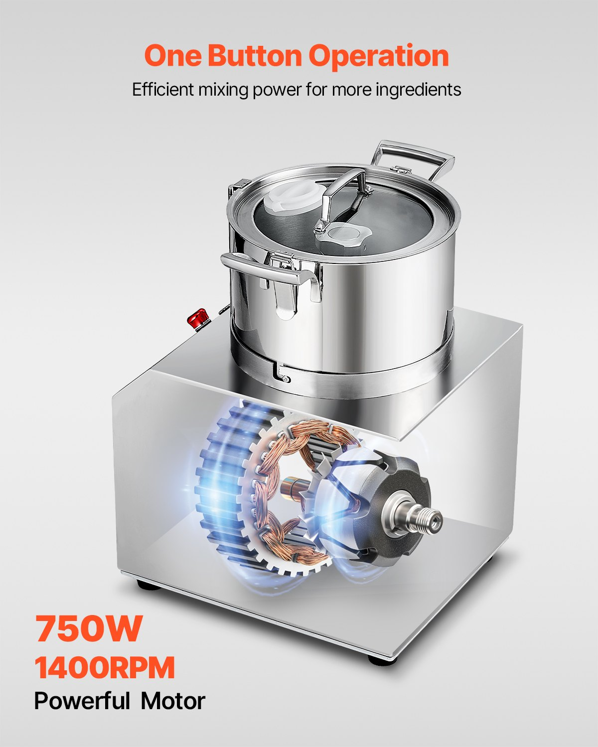 Blade Material: 420J2,Speed: 1400 RPM,Capacity: 6.3 QT / 6 L,Noise: ≤ 75 db,Chopping Bucket Material: 304 Stainless Steel,Item Model Number: SC-7306,Main Body Shell Material: 201 Stainless Steel,Net Weight: 65.1 lbs / 29.5 kg,Power: 750W,Product Size: 14.2 x 14 x 19.1 inches / 360 x 355 x 485 mm