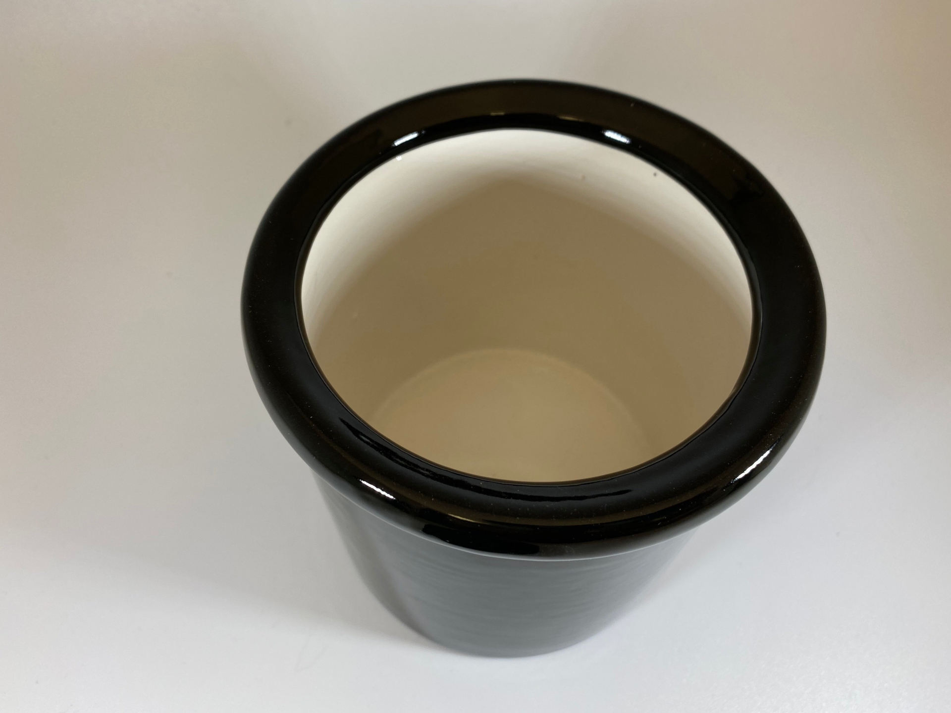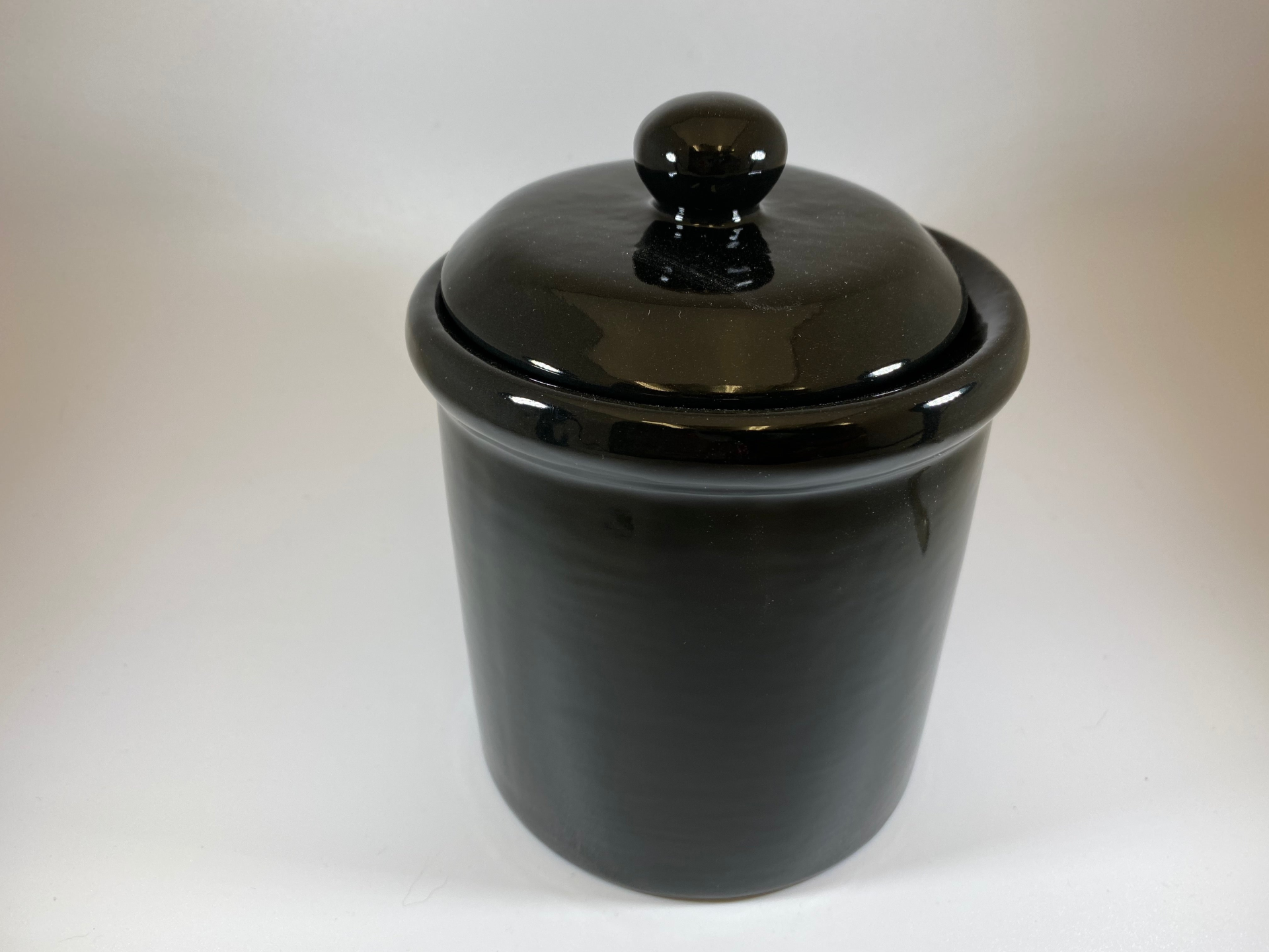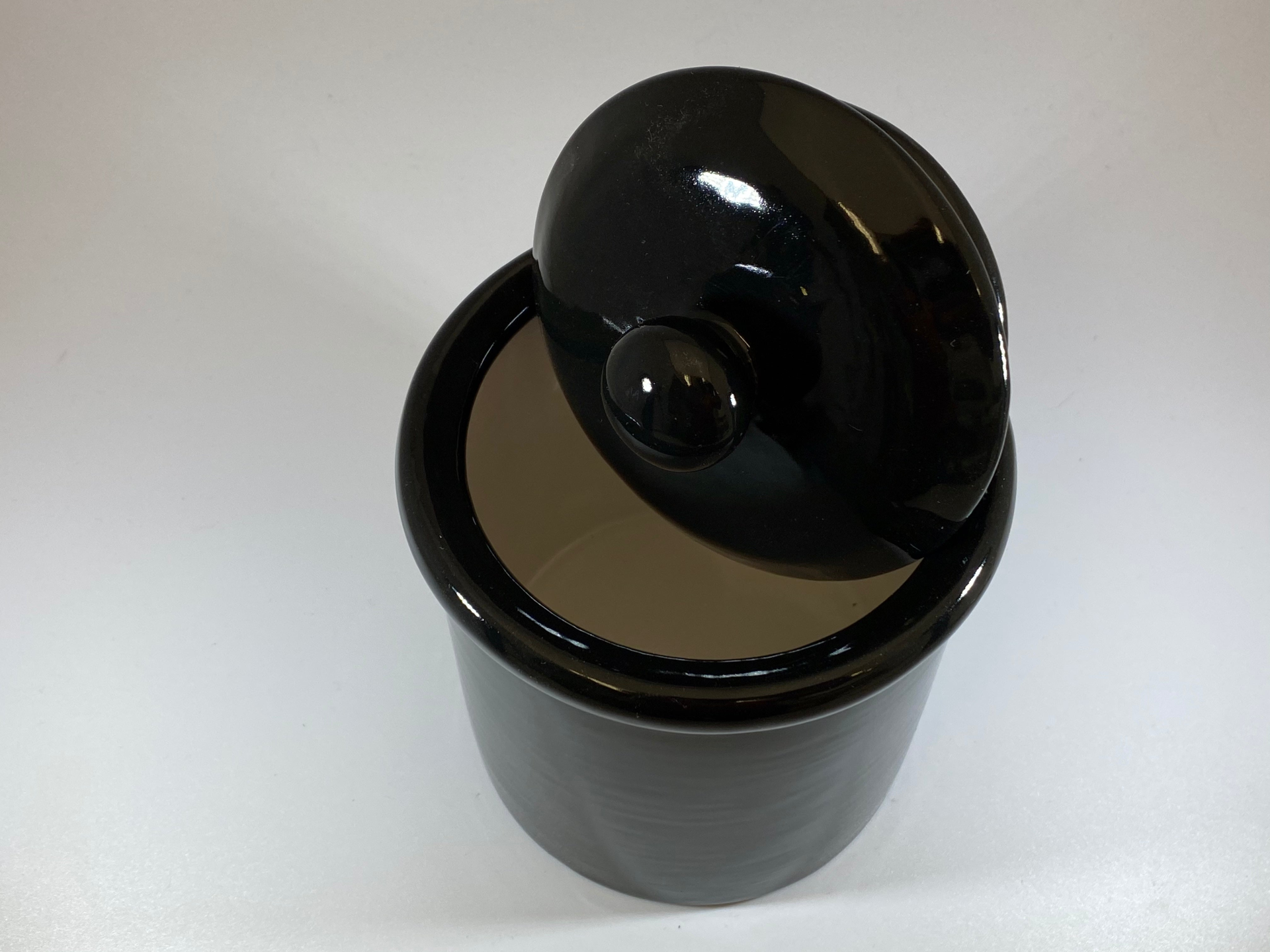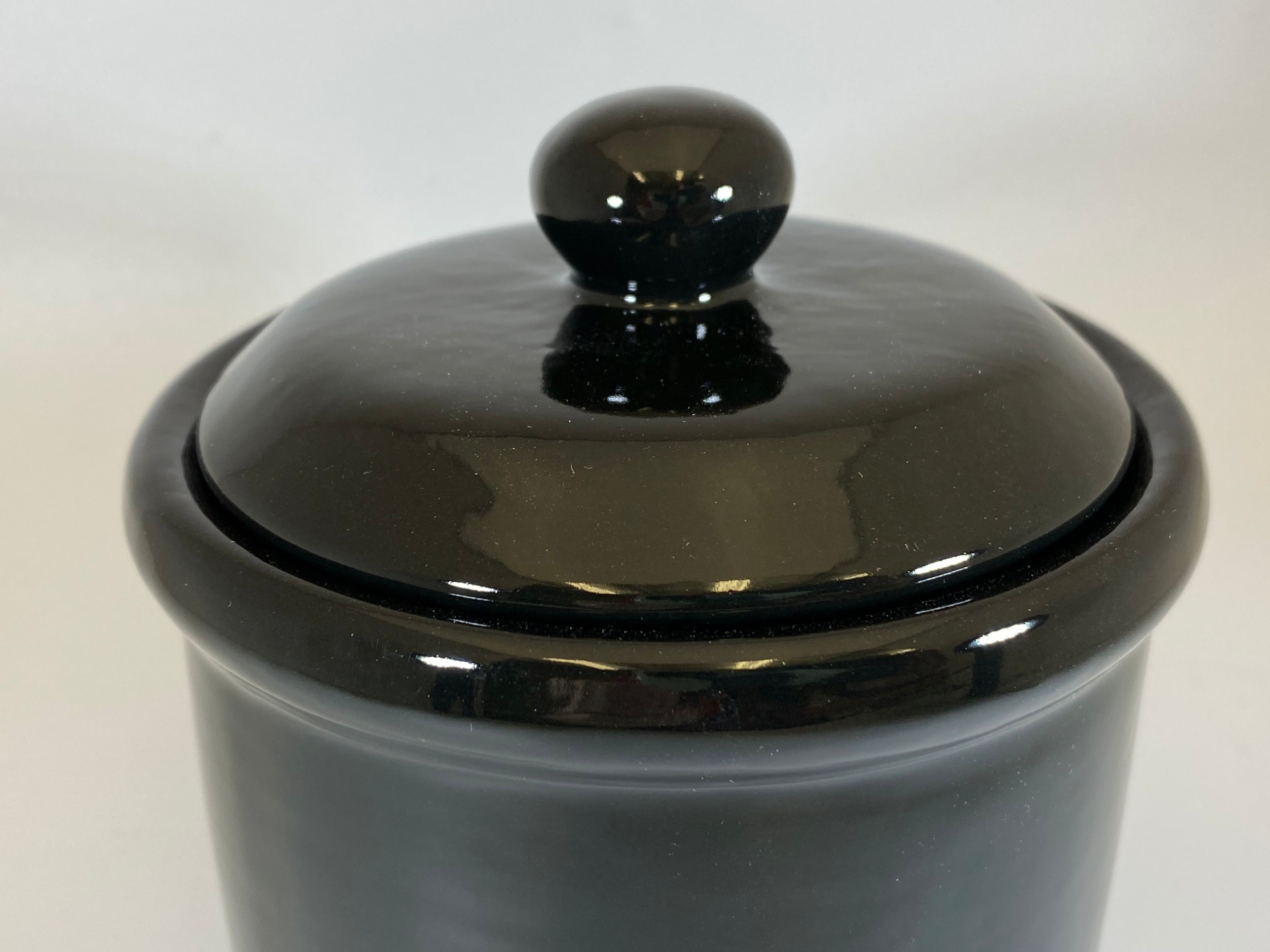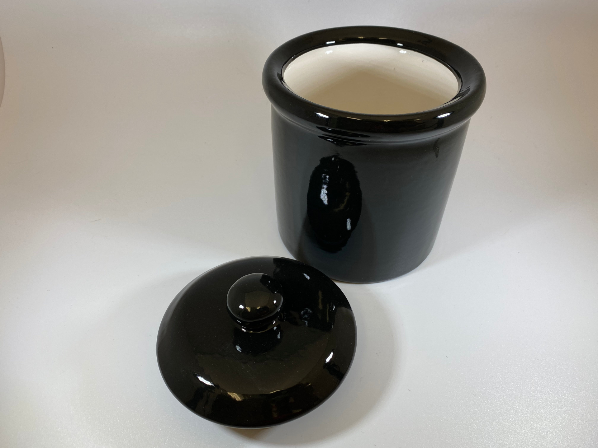 A sleek-looking ceramic canister with jet black glossy finish with a white inside and matching lid with a round knob handle for holding tea or coffee.