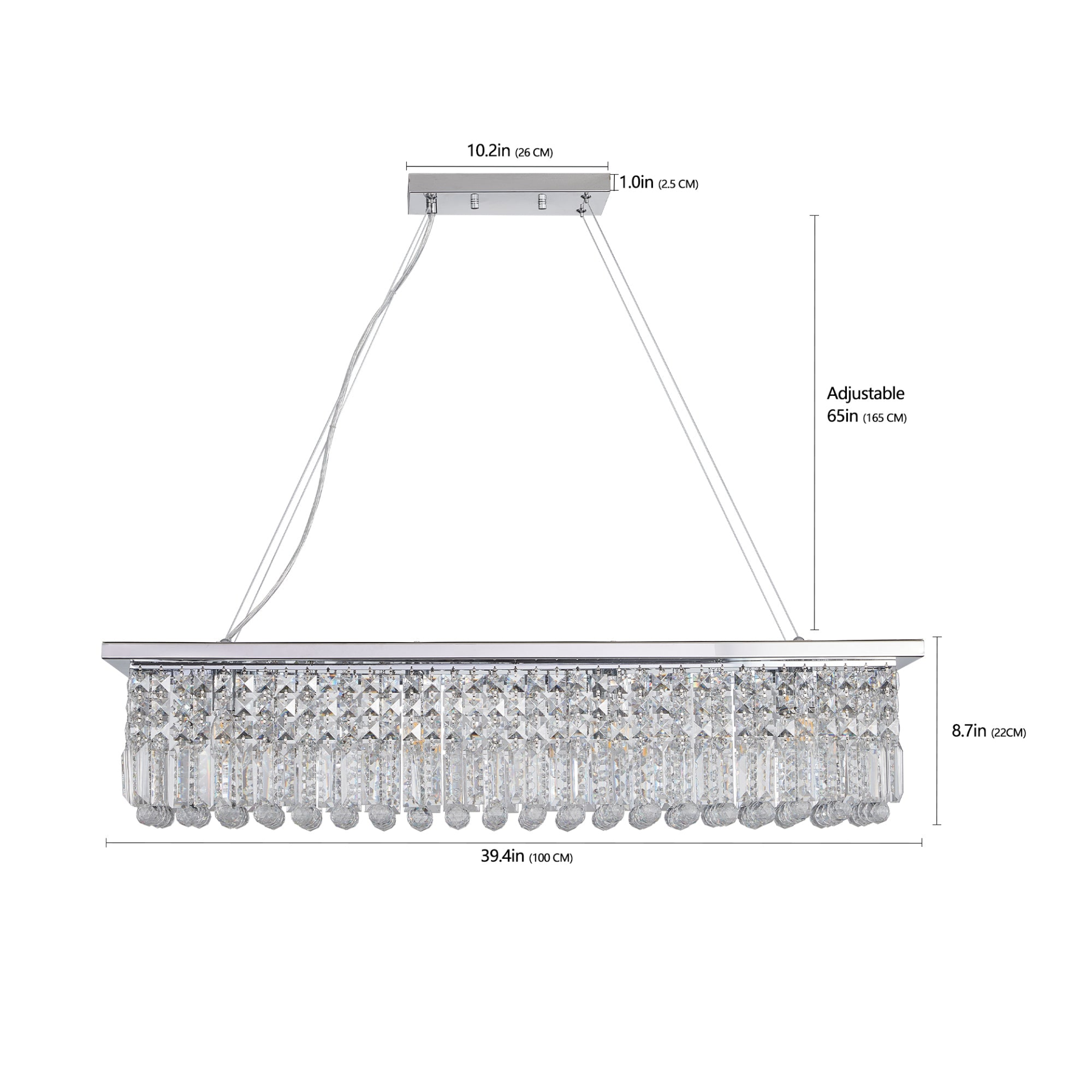 This modern chandelier is built with a high-quality iron metal frame and selected crystals, which is not only durable but also luxurious in appearance, which is the perfect way to enhance your home decoration taste.Rectangular rectangular design, suitable for a variety of interior scenes, including kitchen island, dining table and living room, showing a simple and modern style.This chandelier does not contain bulbs, but is compatible with a variety of lamp types, such as LED bulbs, incandescent bulbs and energy-saving bulbs, giving you the freedom to choose the most suitable light source.With detailed installation instructions and all necessary installation hardware, you can easily complete the installation without professional skills, saving time and money.Although this product does not contain light bulbs, it is recommended to match energy-efficient LED lamps to reduce electricity bills and reduce carbon emissions, providing bright and comfortable lighting effects.