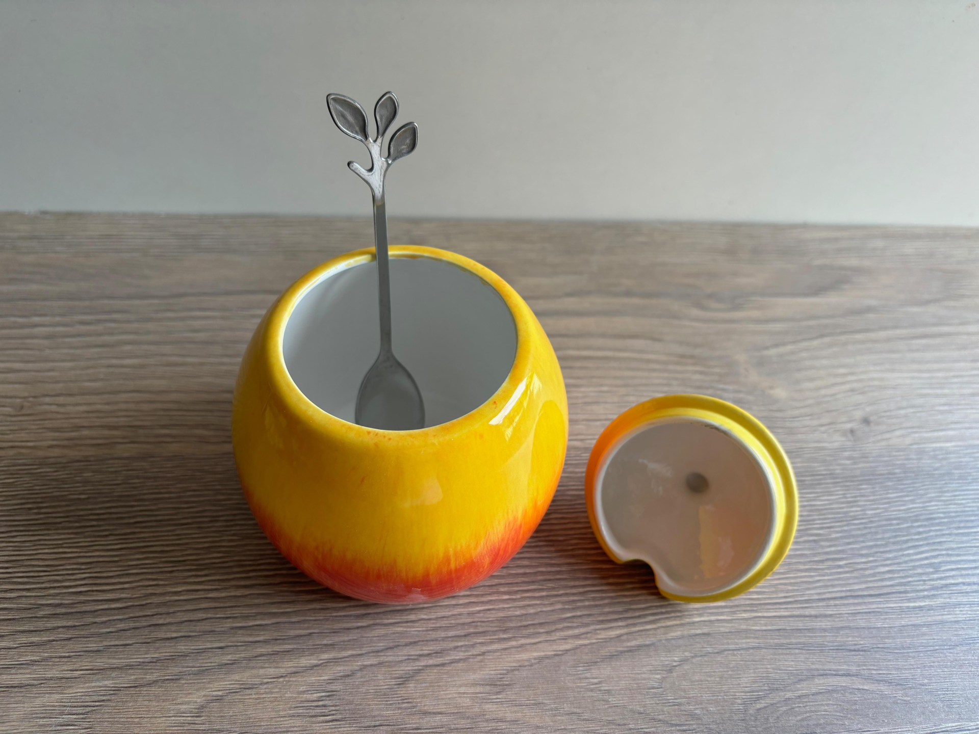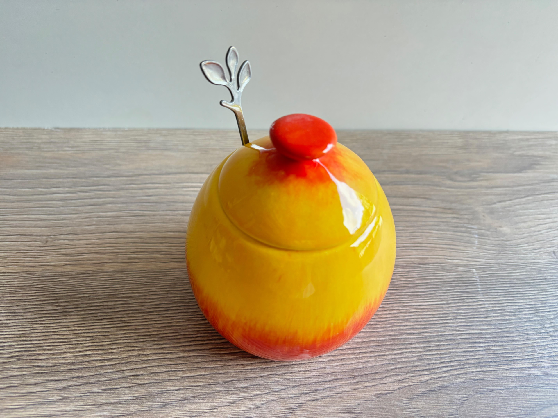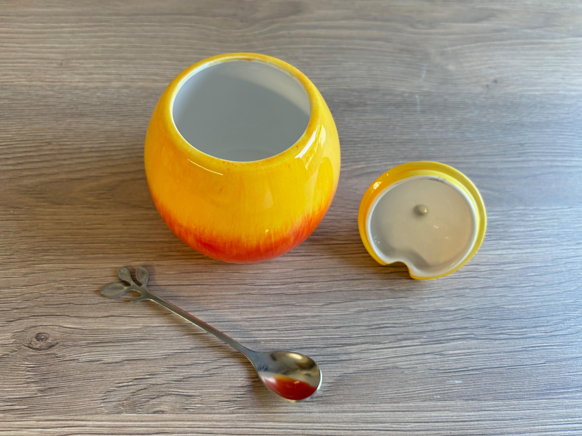A lovely hand-made ceramic sugar bowl with a matching lid and a stainless steel silver leafy spoon finished with a graduated red to yellow glaze on the outside and glossy white inside.