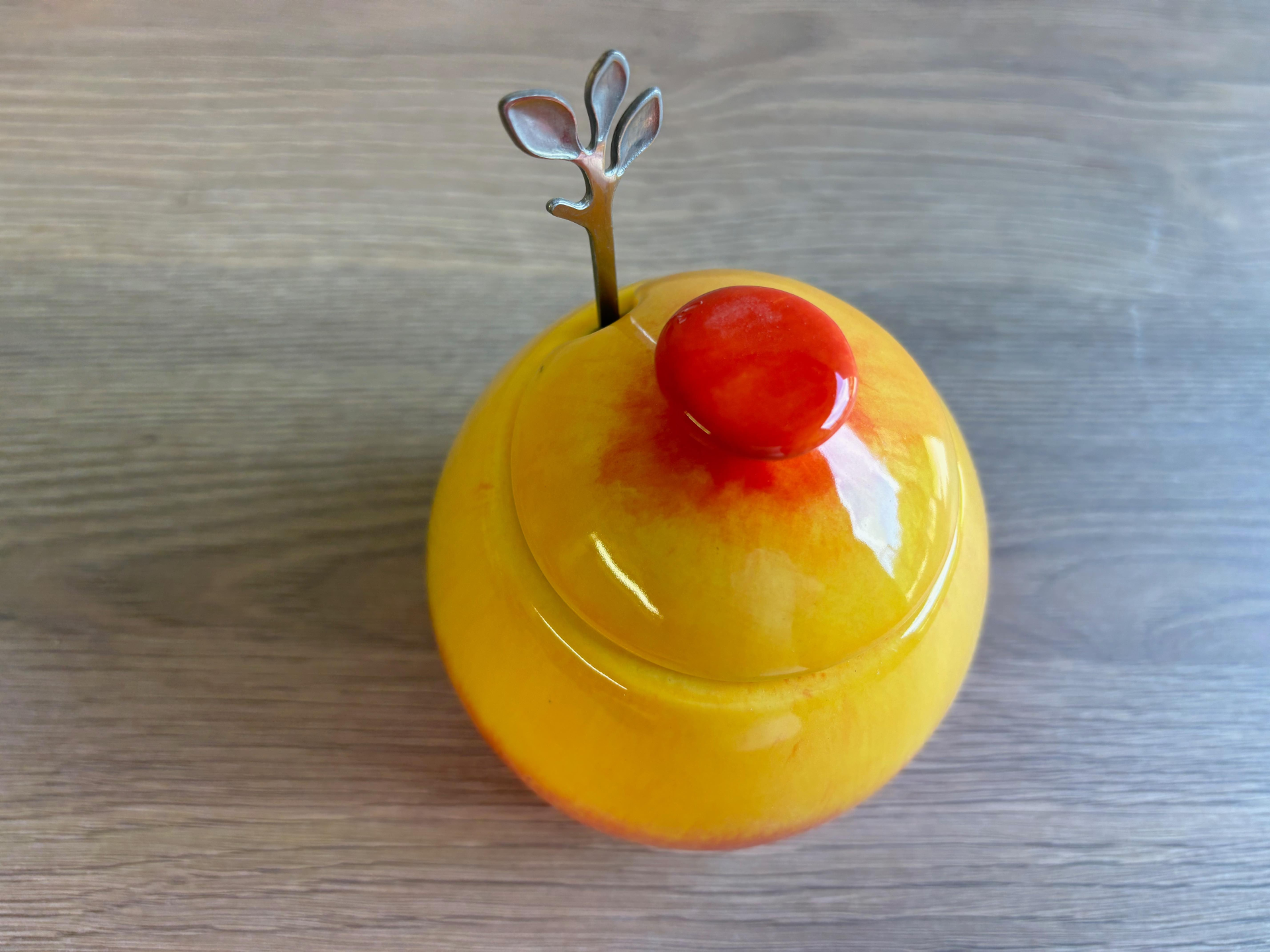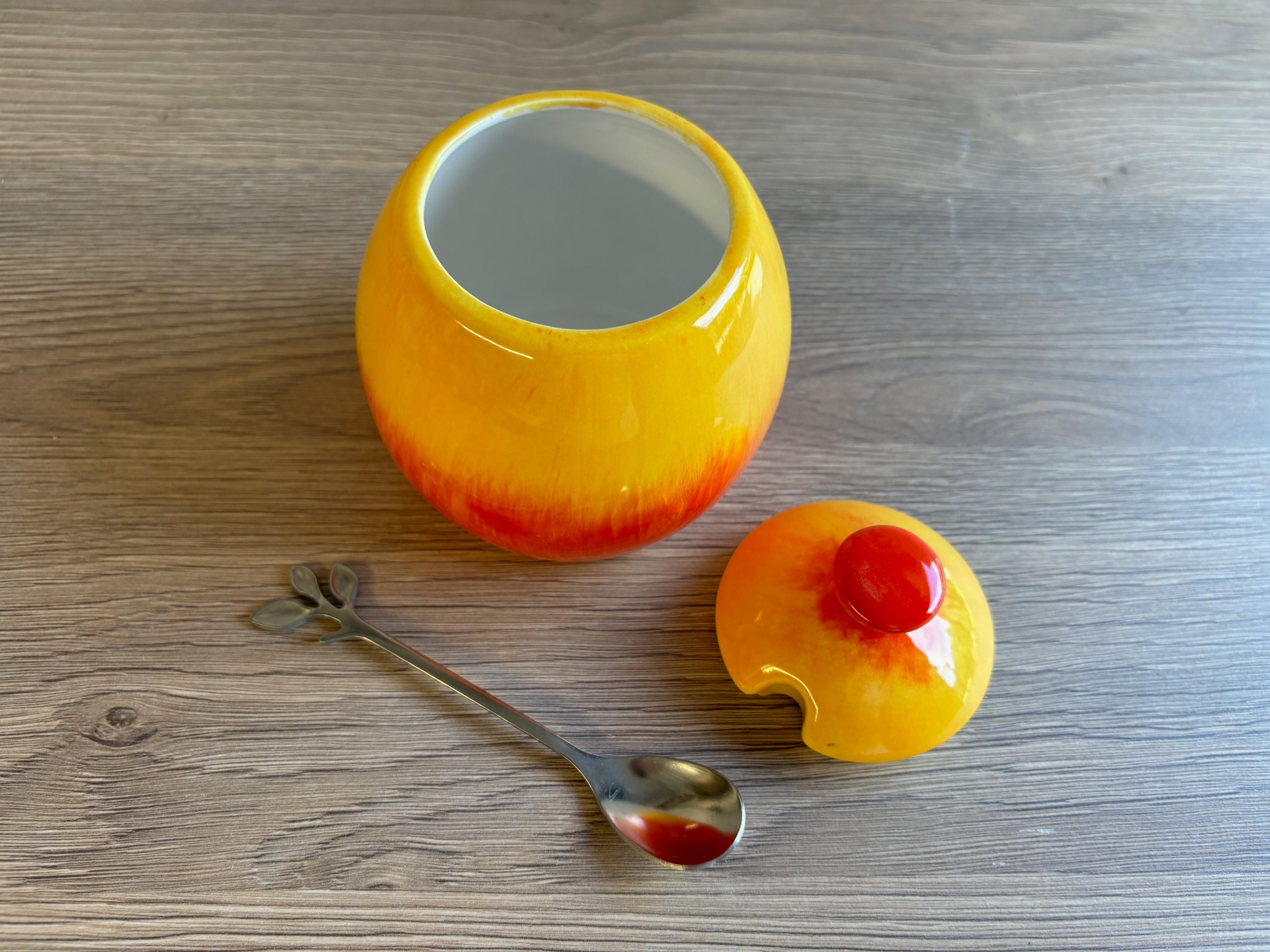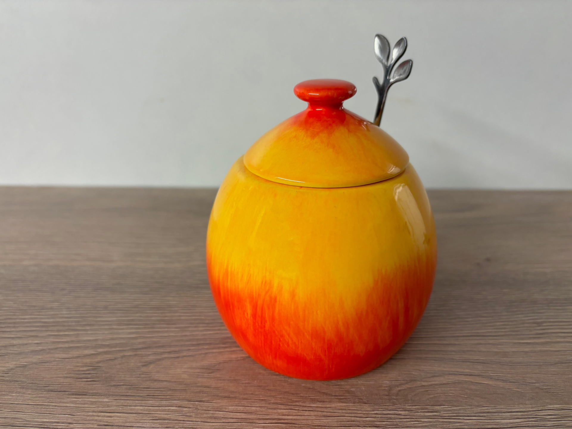 A lovely hand-made ceramic sugar bowl with a matching lid and a stainless steel silver leafy spoon finished with a graduated red to yellow glaze on the outside and glossy white inside.