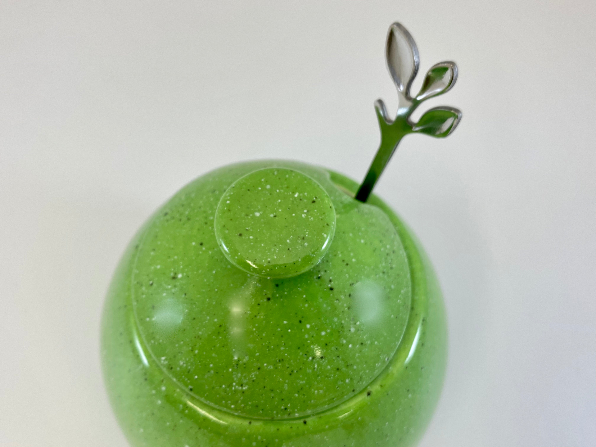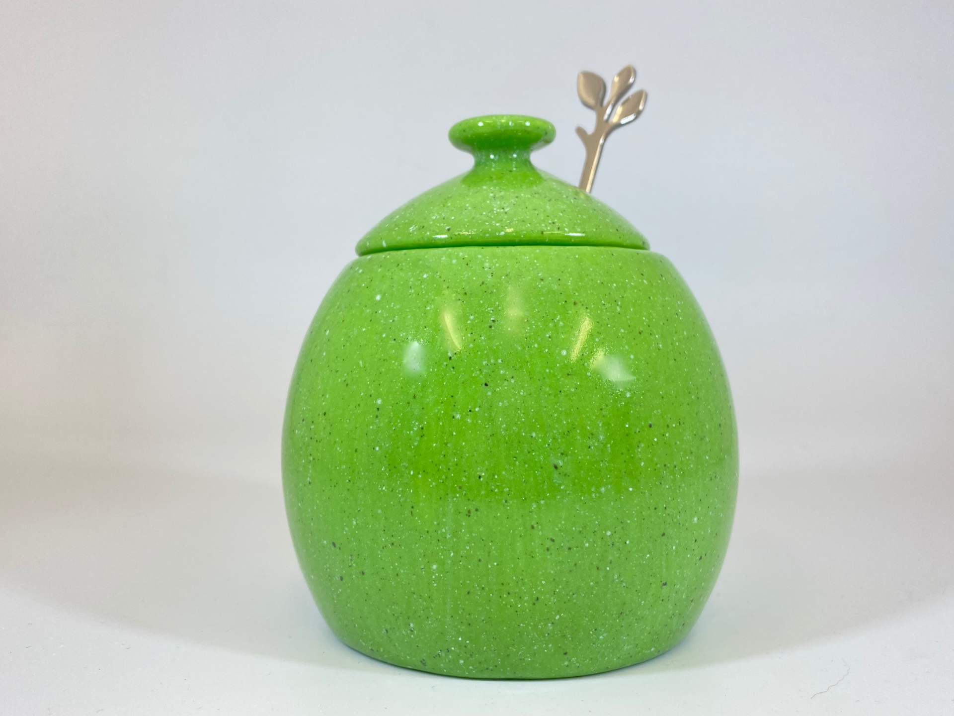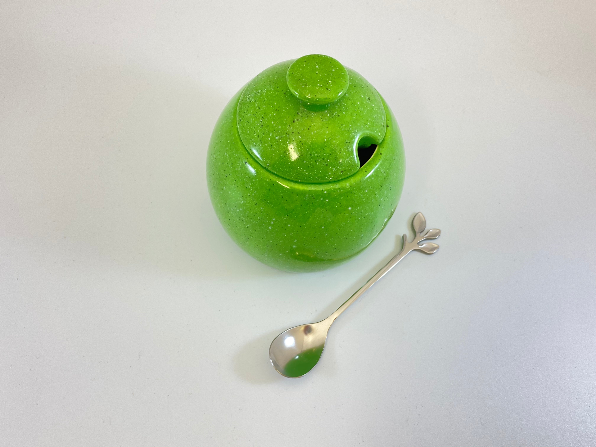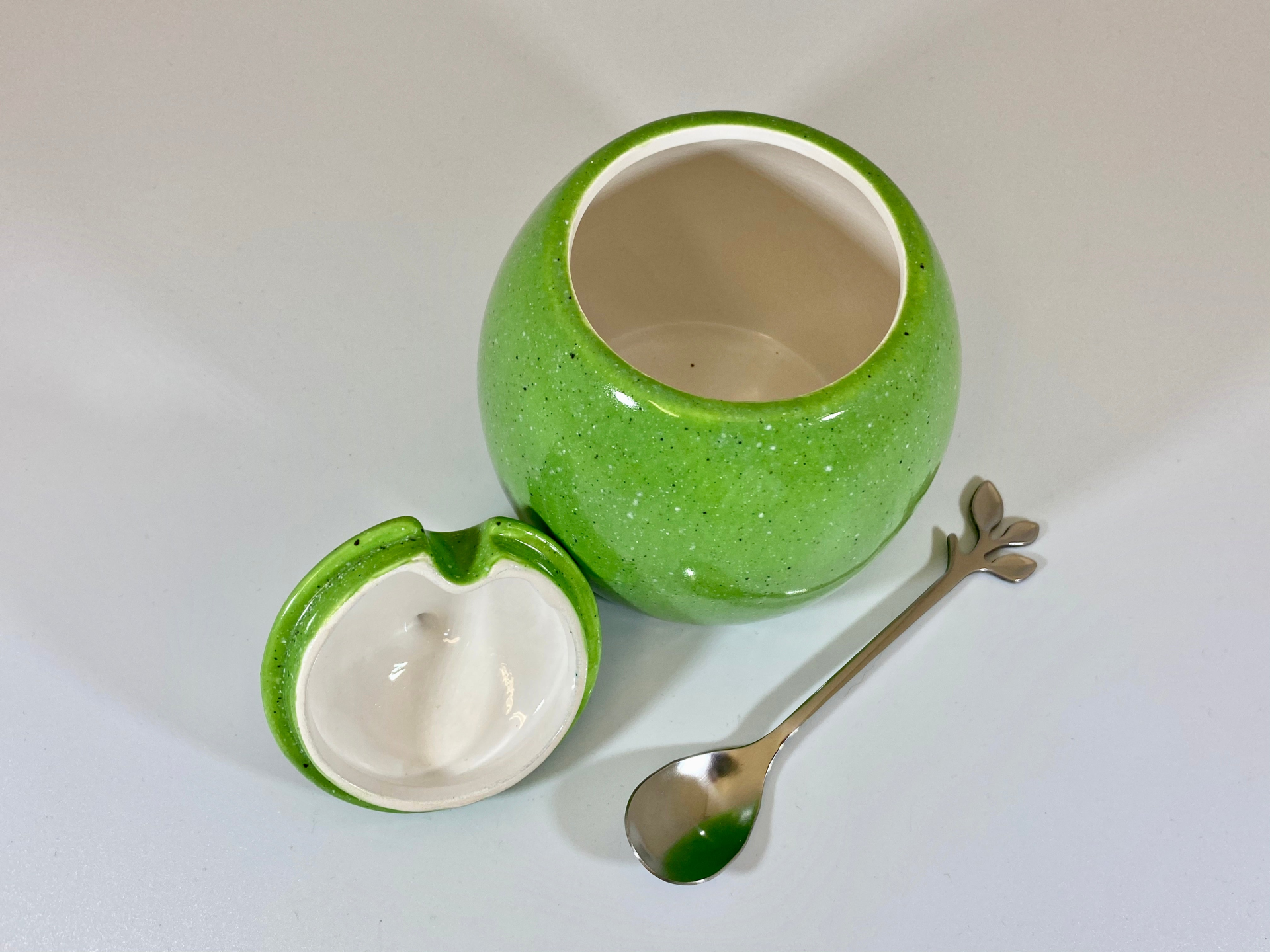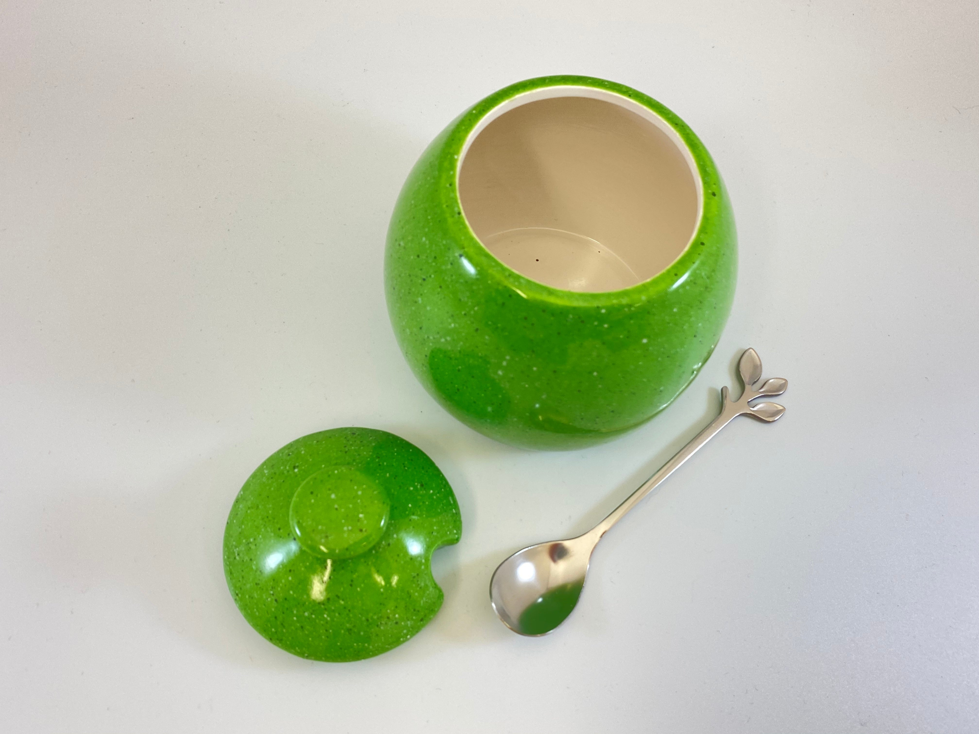 A lovely hand-made ceramic sugar bowl with matching lid and a stainless steel silver leafy spoon finished with a lime green glaze on the outside and glossy white inside.