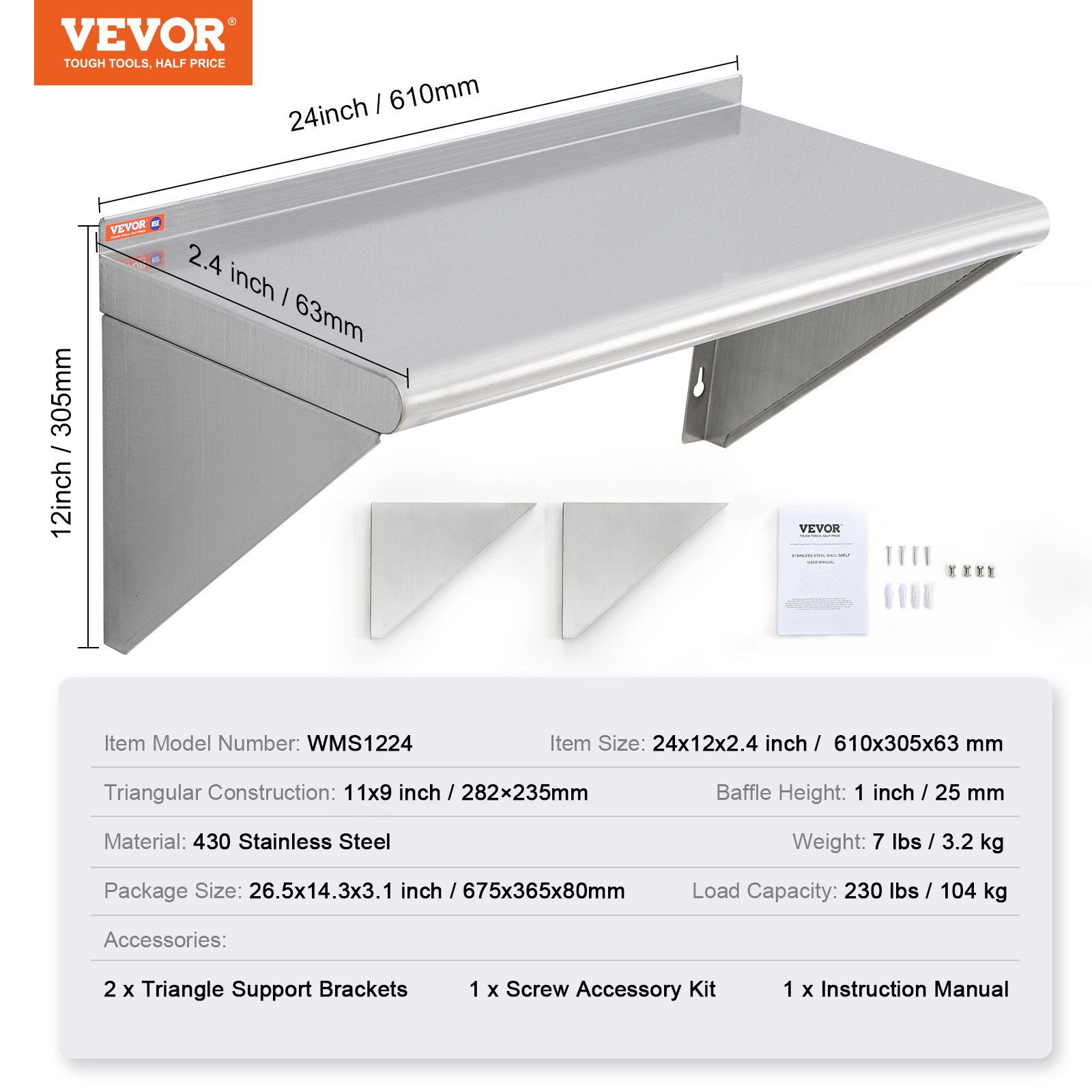 Load Capacity: 230 lbs / 104 kg,Item Model Number: WMS1224,Material: 430 Stainless Steel,Triangular Construction: 11x9 inch / 282x235 mm,Baffle Height: 1 inch / 25 mm,Weight: 7 lbs / 3.2 kg