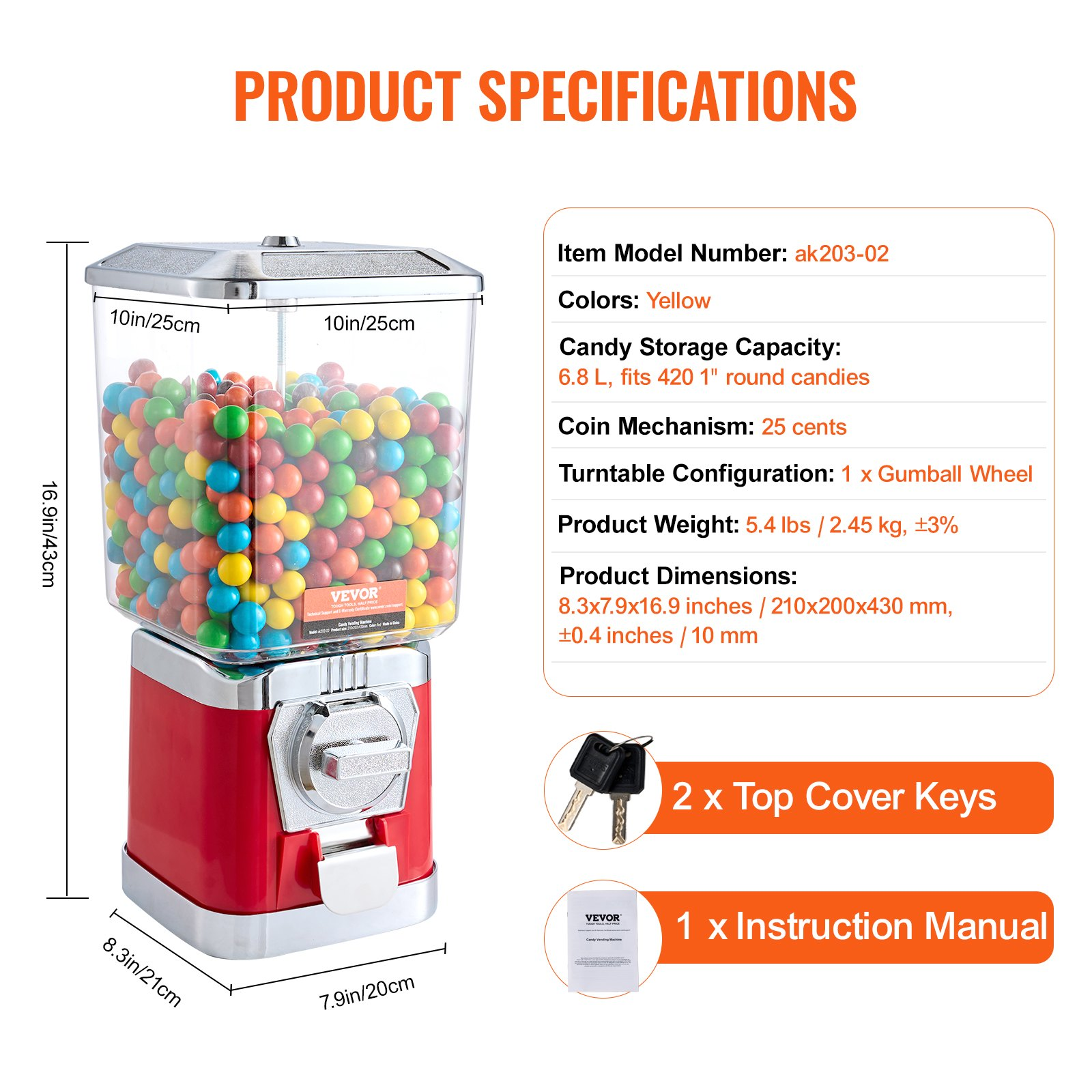 Colors: Red,Item Model Number: ak203-02,Coin Mechanism: 25 Cents,Product Weight: 5.4 lbs / 2.45 kg, ±3%,Candy Storage Capacity: 6.8 L, fits 420 1" round candies,Product Dimensions: 8.3x7.9x16.9 inches / 210x200x430 mm, ±0.4 inches / 10 mm