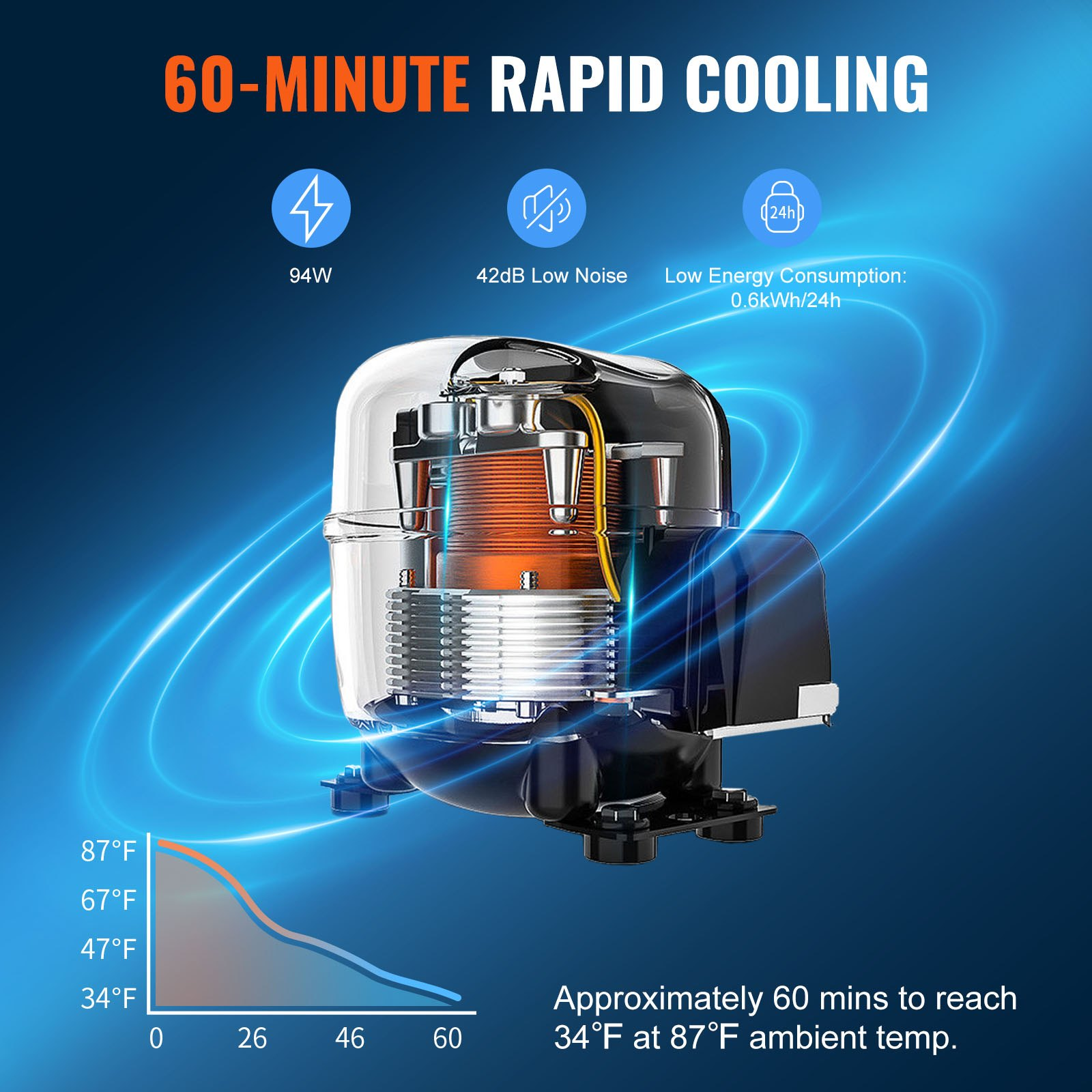 Noise Decibel: ≤42dB,Voltage: AC 115V 60Hz (104V~127V) 1.1A,Dielectric Strength: 1800V (1.0 S),Item Model Number: BC-160OD,Material: Metal Plate,Door & Vent Material: 304 Stainless Steel,Power Factor: 0.7 PF,Cooling Temperature Range: 34ºF - 65ºF (1℃ - 18℃),Power: 94W (Annual Energy Consumption: 235 kWh),Weight: 39kg / 85.98 lbs,Product Size: 23.6 x 25.24 x 33.66 in/600 x 641 x 855mm