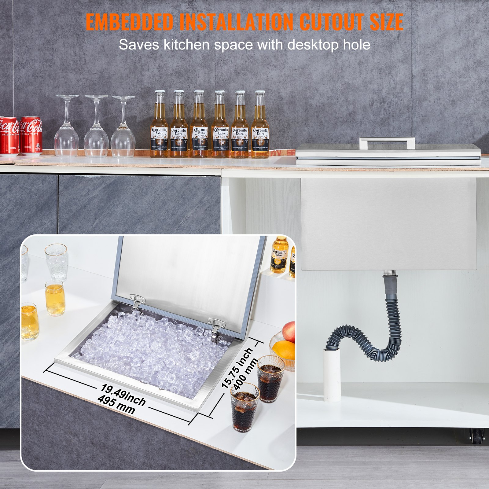 Capacity: 40.2 QT / 38 L,Recommended Cut-out Size: 19.29x15.28 inch / 490x388 mm,Item Model Number: ICB-W201613,Net Weight: 11.7 kg / 25.8 lbs,Main Material: Stainless Steel,Product Size: 20x15.98x14.57 inch / 508x406x370 mm