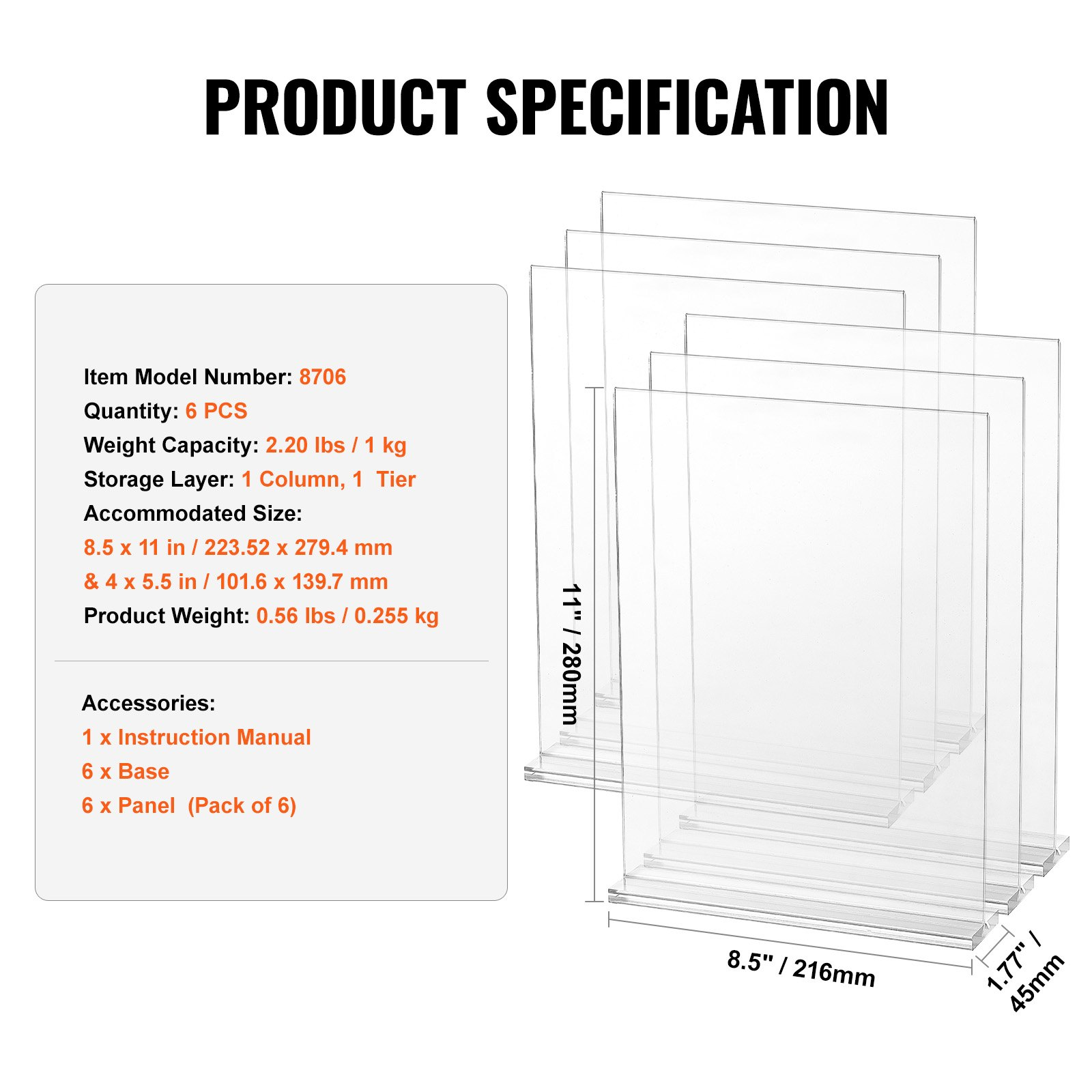 Storage Layer: 1 Column, 1 Tier,Weight Capacity: 2.20 lbs / 1 kg,Item Model Number: 8706,Product Weight: 0.56 lbs / 0.255 kg,Quantity: 6 PCS,Accommodated Size: 8.5 x 11 in / 223.52 x 279.4 mm & 4 x 5.5 in / 101.6 x 139.7 mm,Product Dimensions: 8.5 x 11 x 1.77 in / 235 x 200 x 45 mm