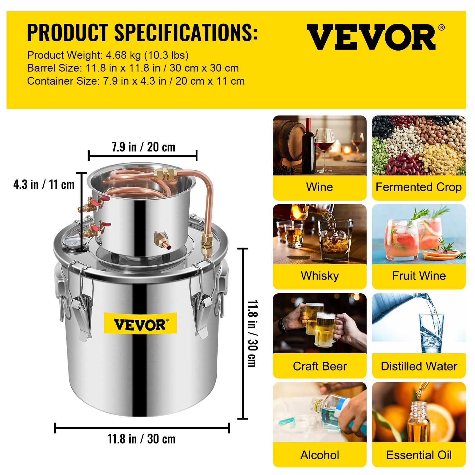 VEVOR Alcohol Still 5 Gal 21L Stainless Steel Water Alcohol Distiller Copper Tube Home Brewing Kit Build-in Thermometer for DIY Whisky Wine Brandy