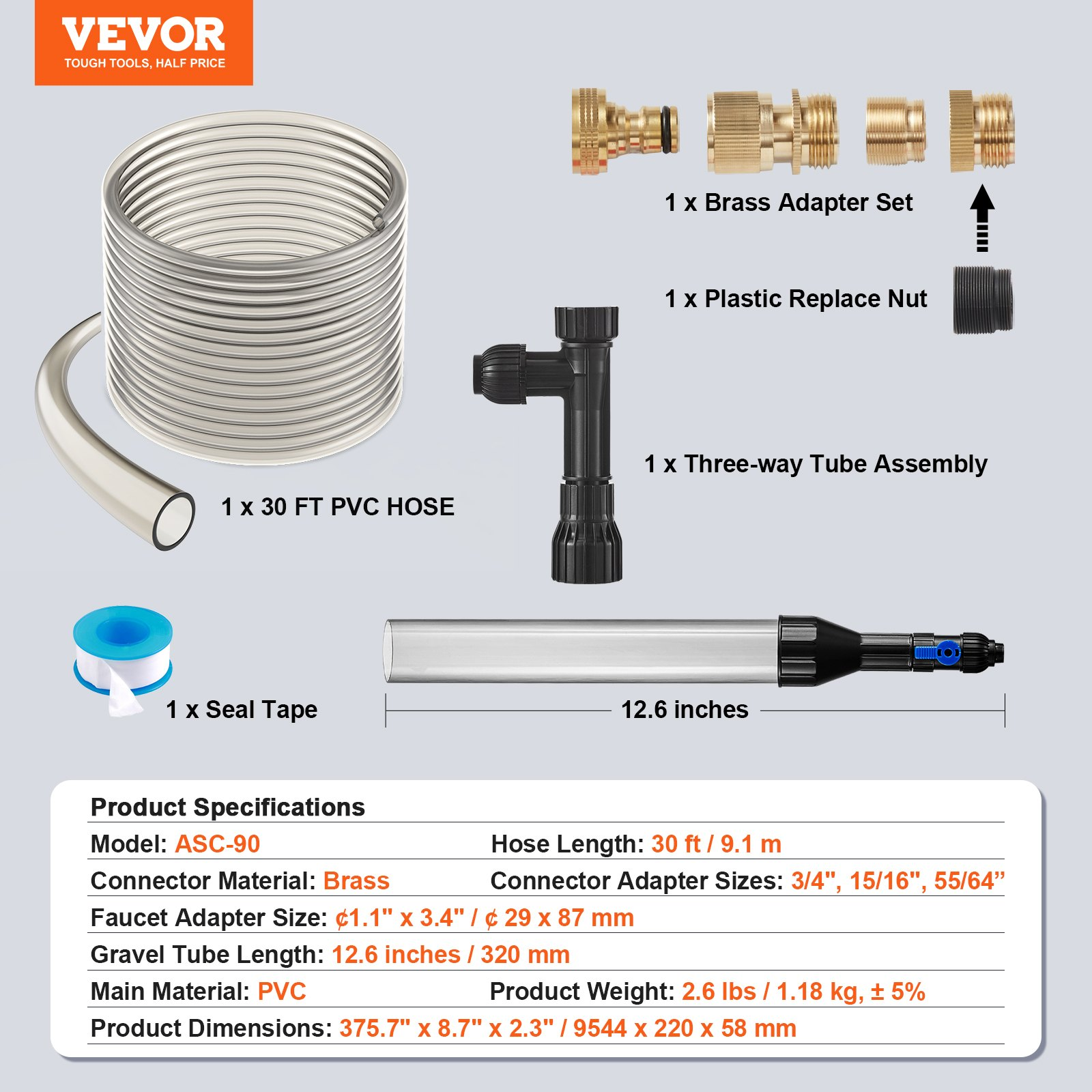 Hose Length: 30 ft / 9.1 m,Connector Material: Brass,Gravel Tube Length: 12.6 inches / 320 mm,Faucet Adapter Size: ¢1.1" x 3.4" / ¢ 29 x 87 mm,Item Model Number: ASC-90,Product Weight: 2.6 lbs / 1.18 kg, ± 5%,Connector Adapter Sizes: 3/4", 15/16", 55/64”,Product Dimensions: 375.7" x 8.7" x 2.3" / 9544 x 220 x 58 mm,Main Material: PVC