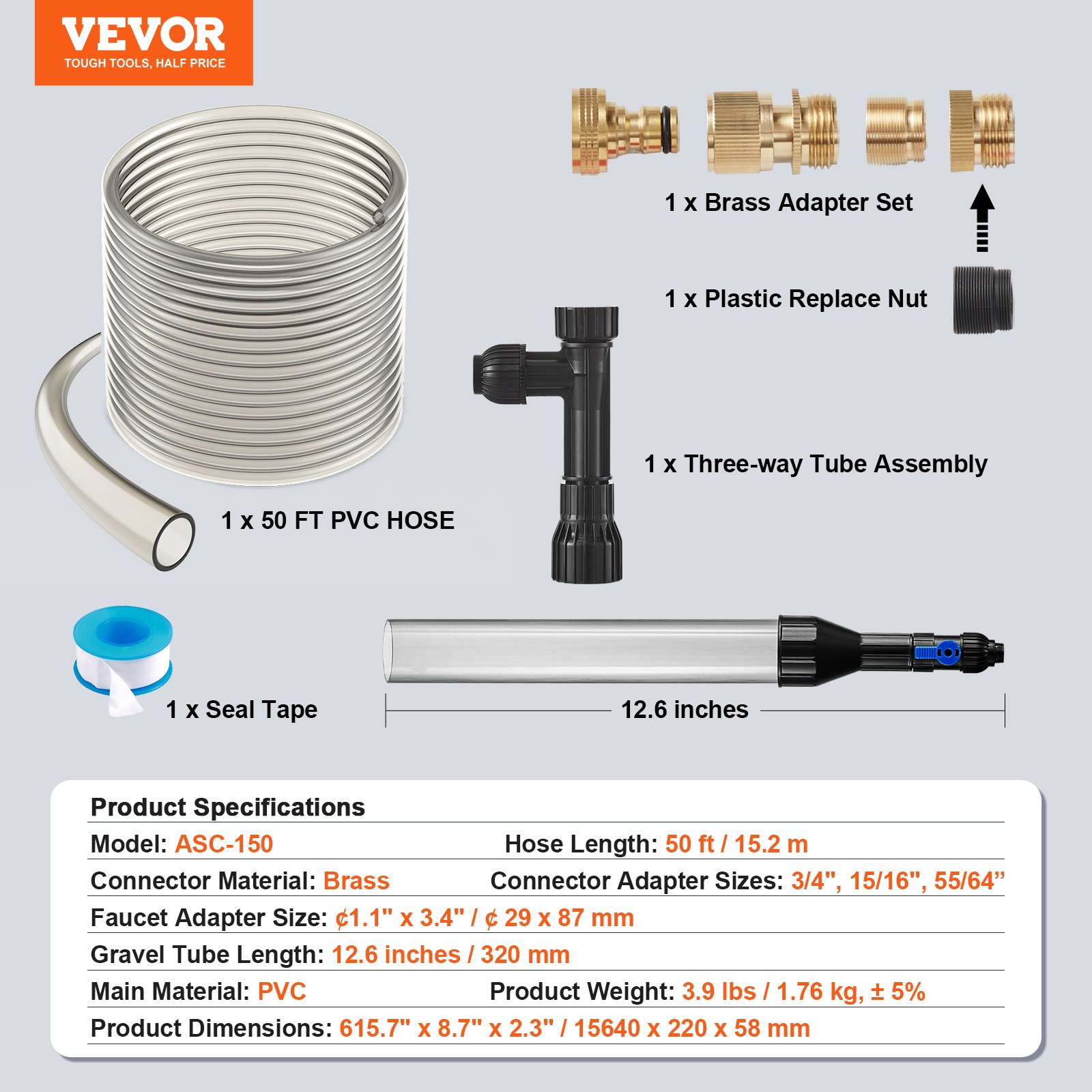 Hose Length: 50 ft / 15.2 m,Connector Material: Brass,Gravel Tube Length: 12.6 inches / 320 mm,Faucet Adapter Size: ¢1.1" x 3.4" / ¢ 29 x 87 mm,Item Model Number: ASC-150,Product Weight: 3.9 lbs / 1.76 kg, ± 5%,Connector Adapter Sizes: 3/4", 15/16", 55/64”,Product Dimensions: 615.7" x 8.7" x 2.3" / 15640 x 220 x 58 mm,Main Material: PVC