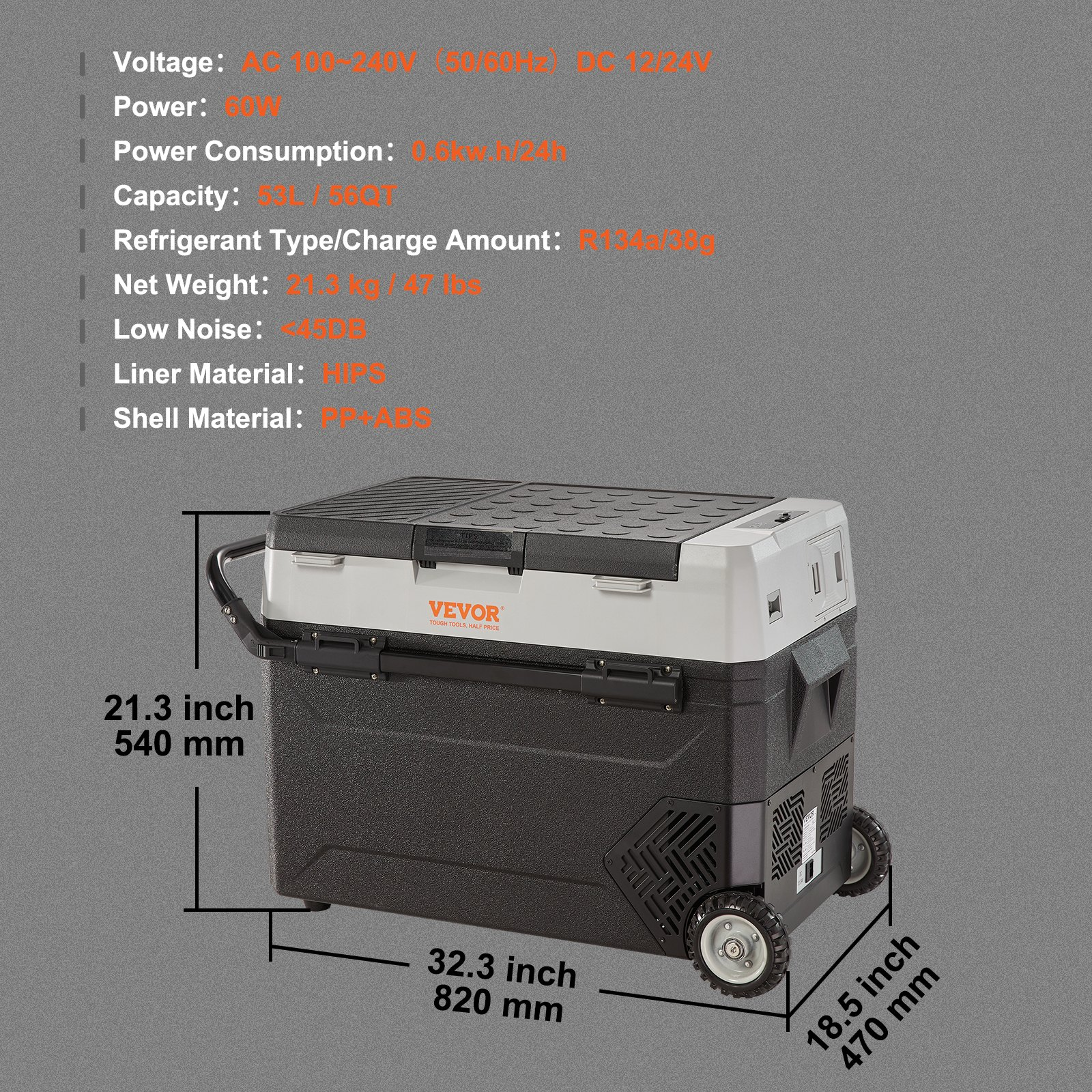 VEVOR Car Refrigerator, 12 Volt Car Refrigerator Fridge, 56 QT/53 L Dual Zone Portable Freezer, -4℉-50℉ Adjustable Range, 12/24V DC and 100-240V AC Compressor Cooler for Outdoor, Camping, Travel, RV