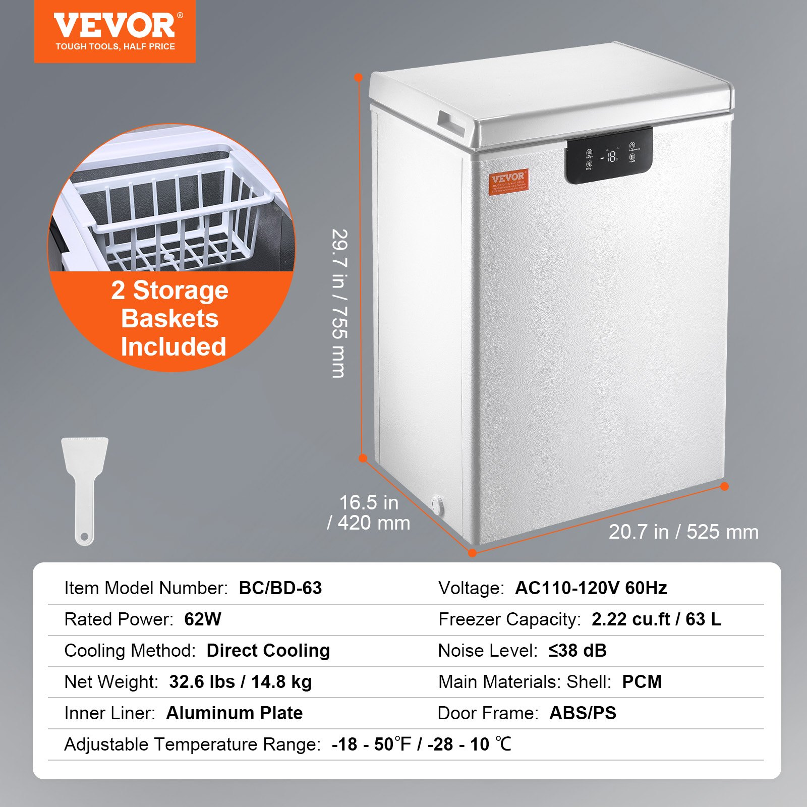 VEVOR Chest Freezer, 2.22 Cu.ft / 63 L Compact Deep Freezer, Free Standing Top Open Door Chest Freezers with 2 Removable Baskets & Adjustable Thermostat, Energy Saving & Low Noise, White