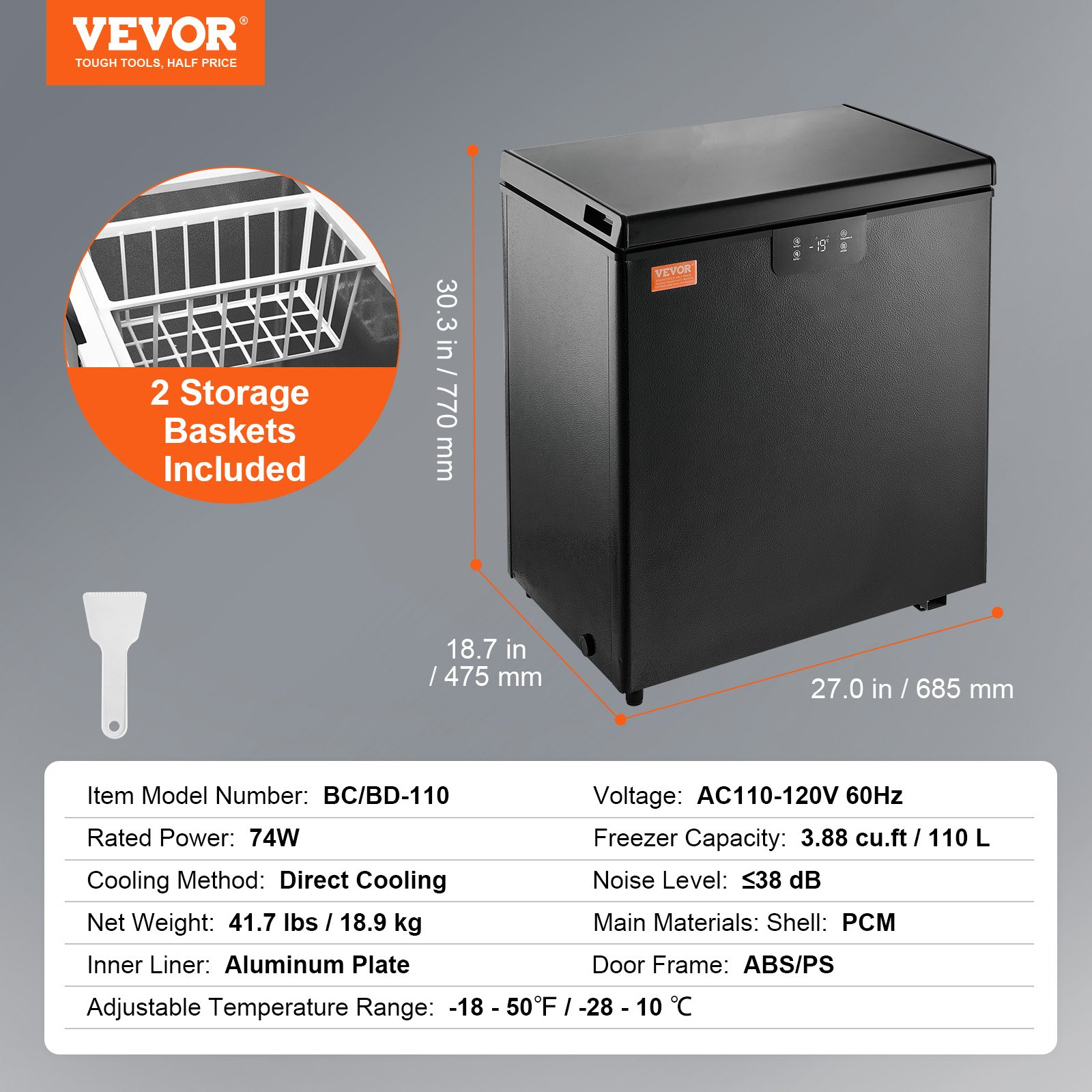 VEVOR Chest Freezer, 3.88 Cu.ft / 110 L Compact Deep Freezer, Free Standing Top Open Door Compact Freezers with 2 Removable Baskets & Adjustable Thermostat, Energy Saving & Low Noise, Black