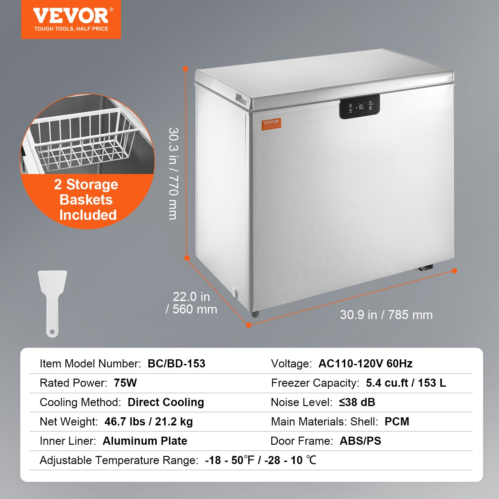 Freezer Capacity: 5.4 cu.ft / 153 L,Noise Level: 38 dB,Main Materials: Shell: PCM ; Inner Tank: Aluminum Plate ; Door Frame: ABS/PS,Cooling Method: Direct Cooling,Item Model Number: BD/BC-153EC,Rated Power: 75W,Adjustable Temperature Range: -18.4 - 50℉ / -28 - 10 ℃,Net Weight: 46.7 lbs / 21.2 kg