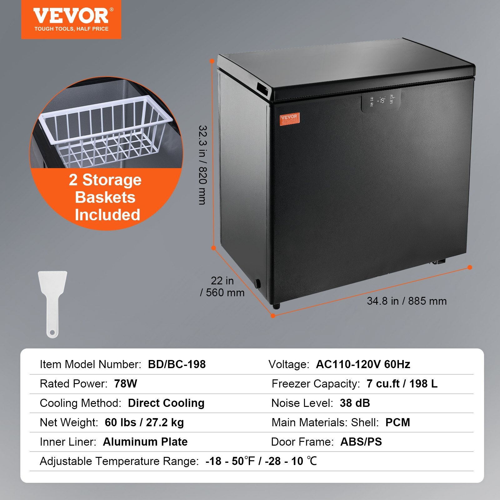 VEVOR Chest Freezer, 7 Cu.ft / 198 L Compact Deep Freezer, Free Standing Top Open Door Compact Freezers with 2 Removable Baskets & Adjustable Thermostat, Energy Saving & Low Noise, Black
