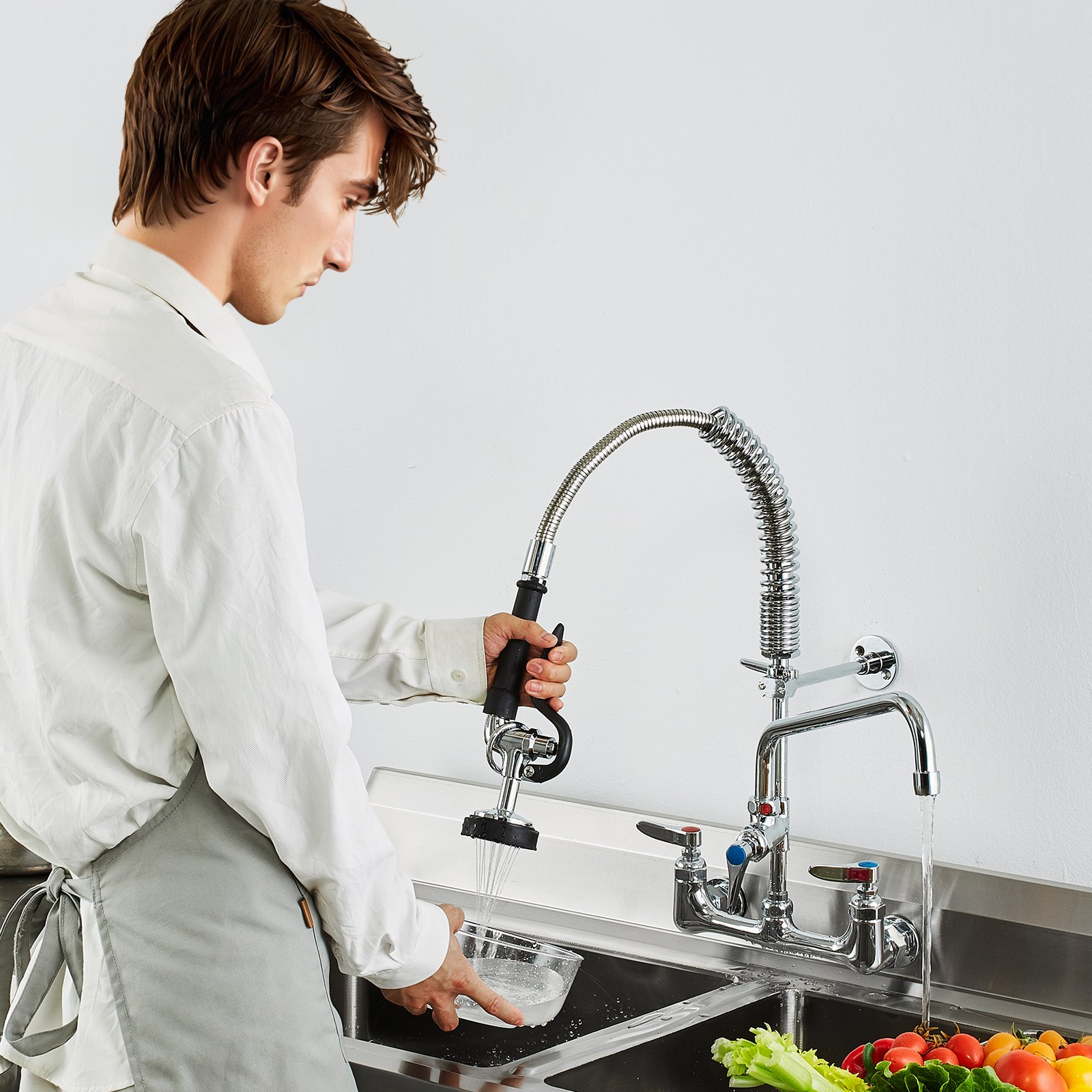 VEVOR Commercial Faucet with Pre-Rinse Sprayer, 21" Height, 8" Center, 12" Swing Spout, Wall Mount Kitchen Sink Faucet, Brass Constructed Device with Pull Down Spray, for 1/2/3 Compartment Sink