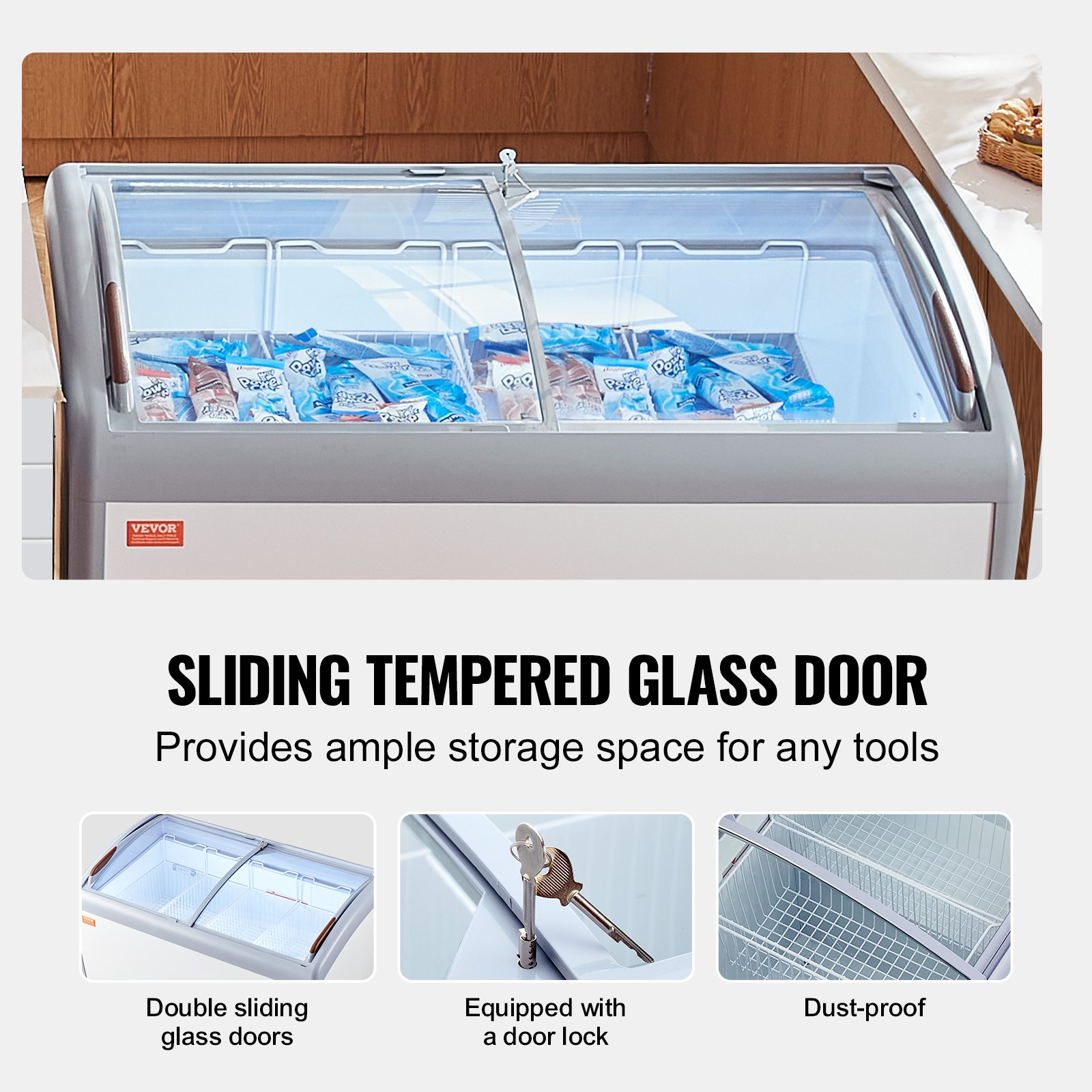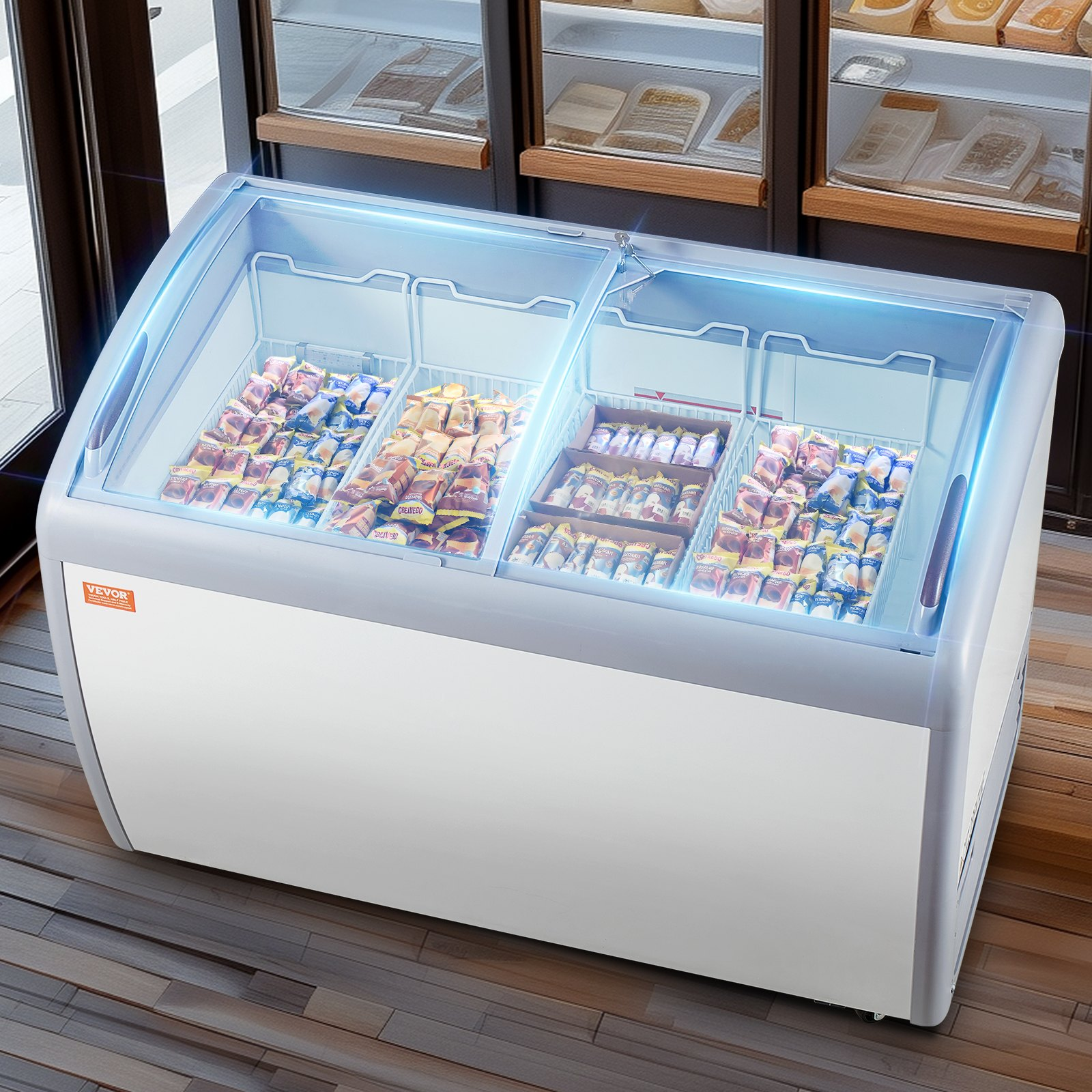 VEVOR Commercial Ice Cream Display Case, 12.8 Cu.ft Chest Freezer, Mobile Glass Top Deep Freezer, Restaurant Gelato Dipping Cabinet with 4 Wire Baskets, 2 Sliding Glass Doosr, Locking Casters, White