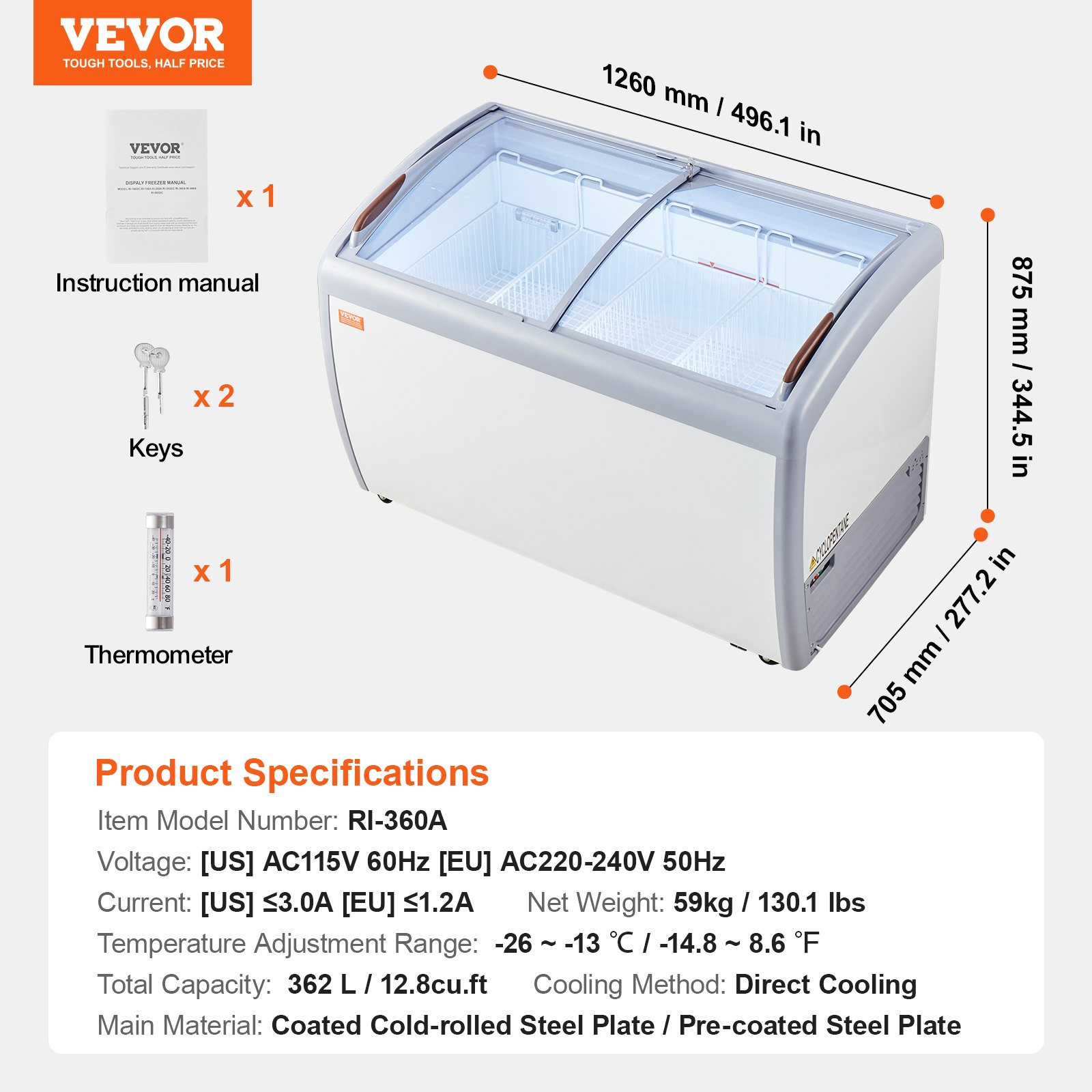 Temperature Adjustment Range: -26 ~ -13 ℃ / -14.8 ~ 8.6 ℉,Total Capacity: 362 L / 12.8 cu.ft,Cooling Method: Direct Cooling,Voltage: AC115V 60Hz,Item Model Number: RI-360A,Net Weight: 59 kg / 130.1 lb,Main Material: Coated Cold-rolled Steel Plate / Pre-coated Steel Plate