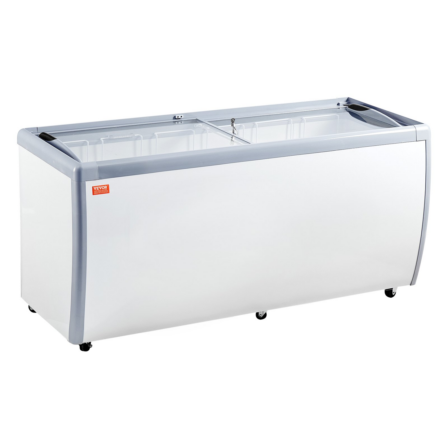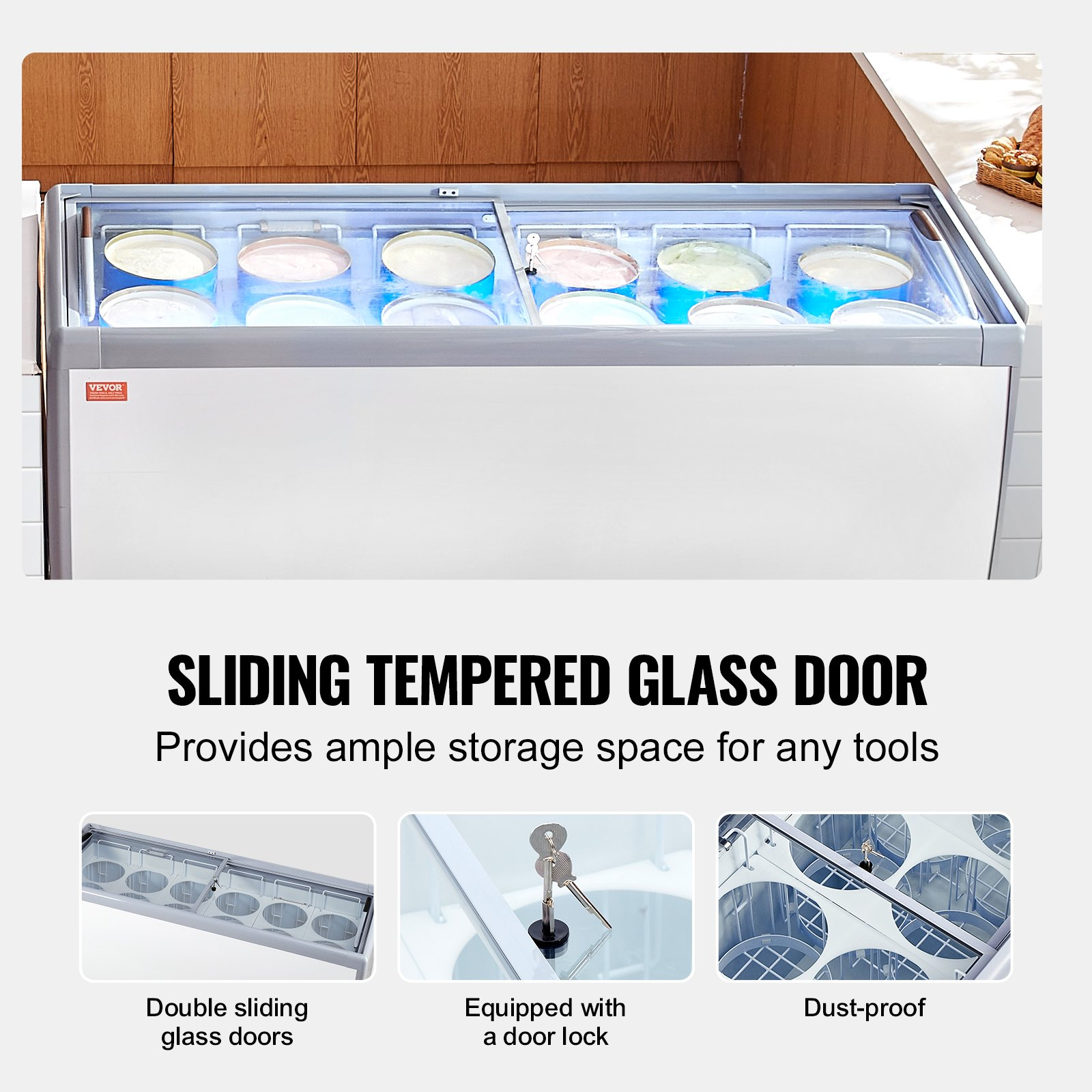 VEVOR Commercial Ice Cream Display Case, 20 Cu.ft Chest Freezer, Mobile Glass Top Deep Freezer, Restaurant Gelato Dipping Cabinet with 12 Large Tubs, 2 Sliding Glass Doors, Locking Casters, White