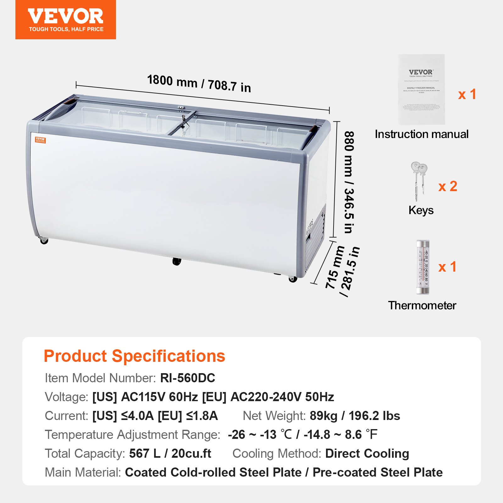 Temperature Adjustment Range: -26 ~ -13 ℃ / -14.8 ~ 8.6 ℉,Total Capacity: 567 L / 20 cu.ft,Cooling Method: Direct Cooling,Voltage: AC115V 60Hz,Item Model Number: RI-560DC,Net Weight: 89 kg / 196.2 lbs,Main Material: Coated Cold-rolled Steel Plate / Pre-coated Steel Plate