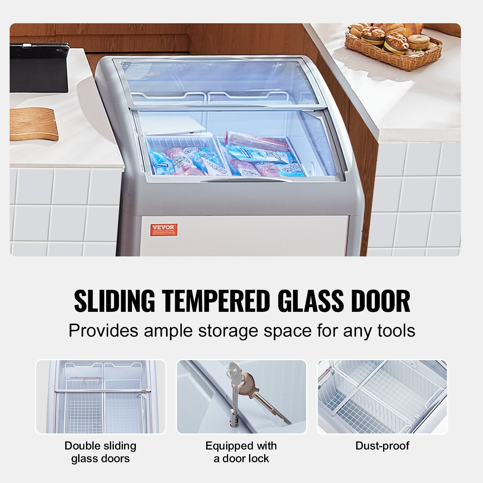 VEVOR Commercial Ice Cream Display Case, 5.4 Cu.ft Chest Freezer, Mobile Glass Top Deep Freezer, Restaurant Gelato Dipping Cabinet with 2 Wire Baskets, 2 Sliding Glass Doors, Locking Casters, White