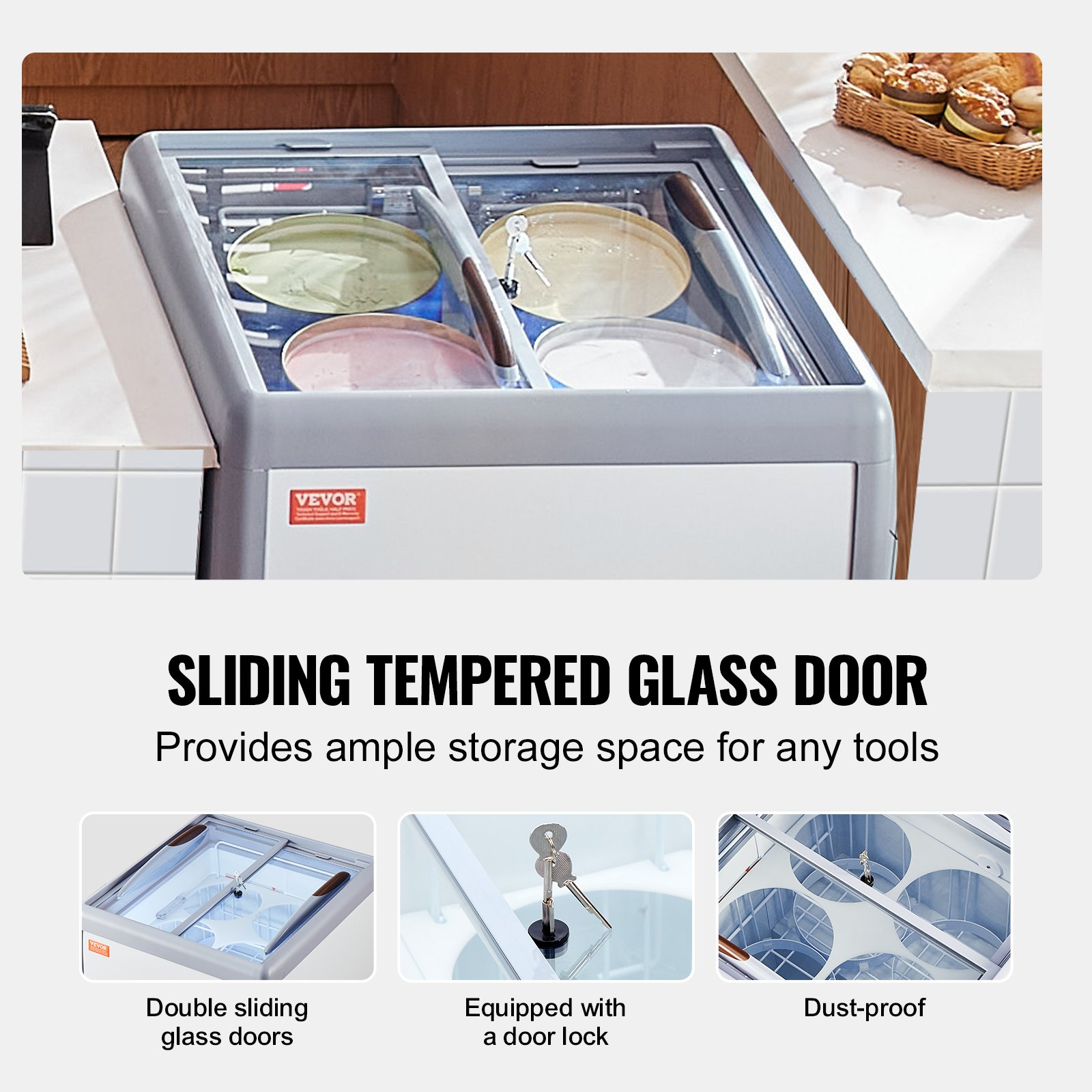 VEVOR Commercial Ice Cream Display Case, 5.6 Cu.ft Chest Freezer, Mobile Glass Top Deep Freezer, Restaurant Gelato Dipping Cabinet with 4 Large Tubs, 2 Sliding Glass Doors, Locking Casters, White