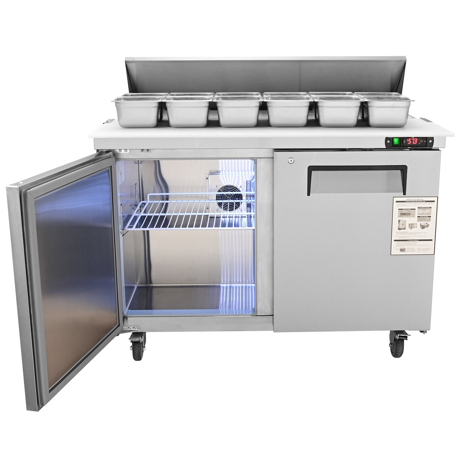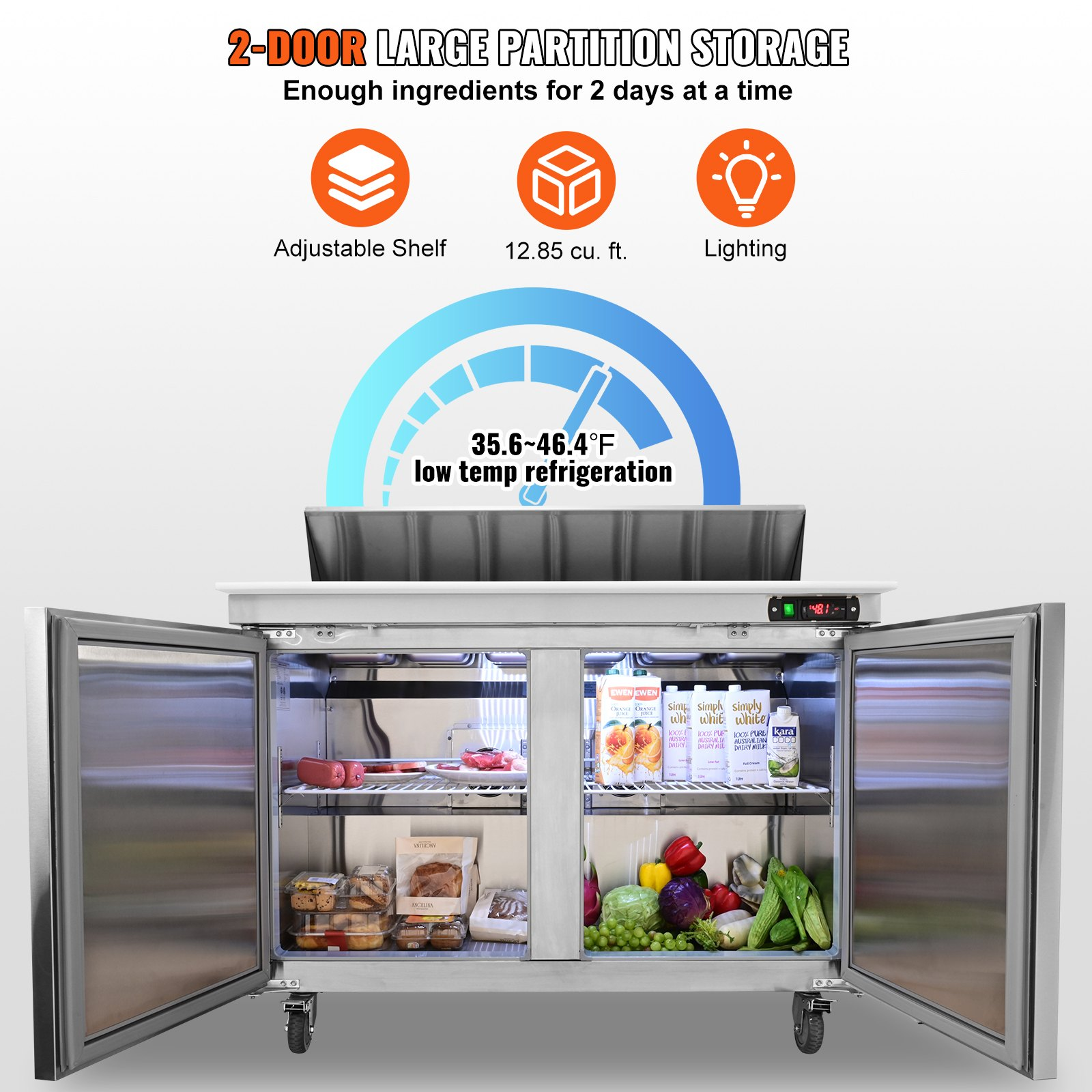 Freezer Capacity: 364L/12.85 Cu. Ft.,Product Type: Sandwich/Salad Double-door Refrigerated Prep Table,Item Model Number: KSR-48B,Product Weight: 229 LBS / 104 Kg,Rated Power: 390W,Storage Temp: 35.6~46.4℉,Material: Stainless Steel,Cable Length: 82.7 in/ 2.1m,Voltage / Frequency: AC110-120V/60Hz,Product Size: 48 x 29.9 x 42.8 in / 1220 x 760 x 1090 mm