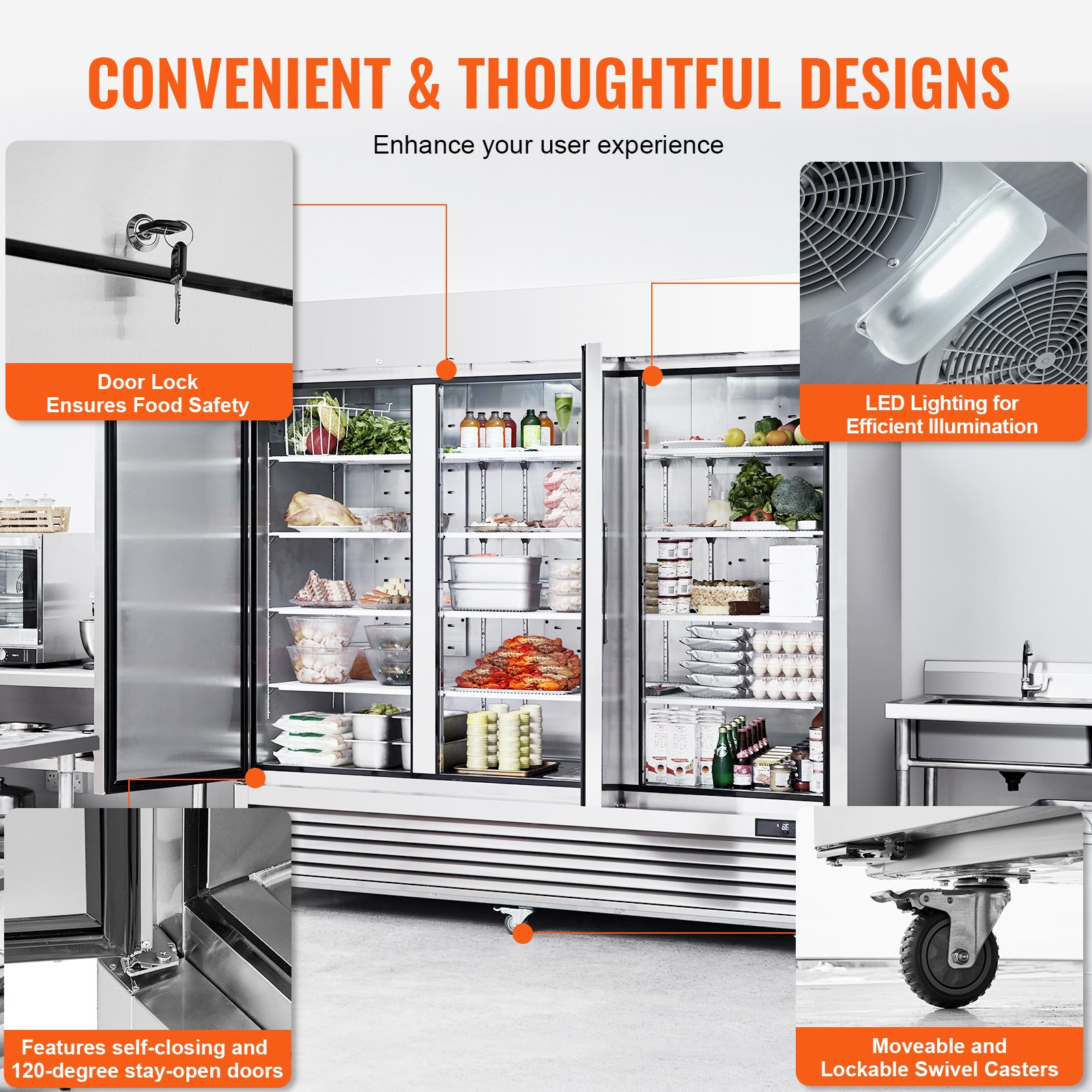 VEVOR Commercial Refrigerator 60.42 Cu.ft, Reach In 82.5" W Upright Refrigerator 3 Doors, Auto-Defrost Stainless Steel Reach-in Refrigerator & 12 Shelves, 33 to 41℉ Temp Control, LED Light, 4 Wheels
