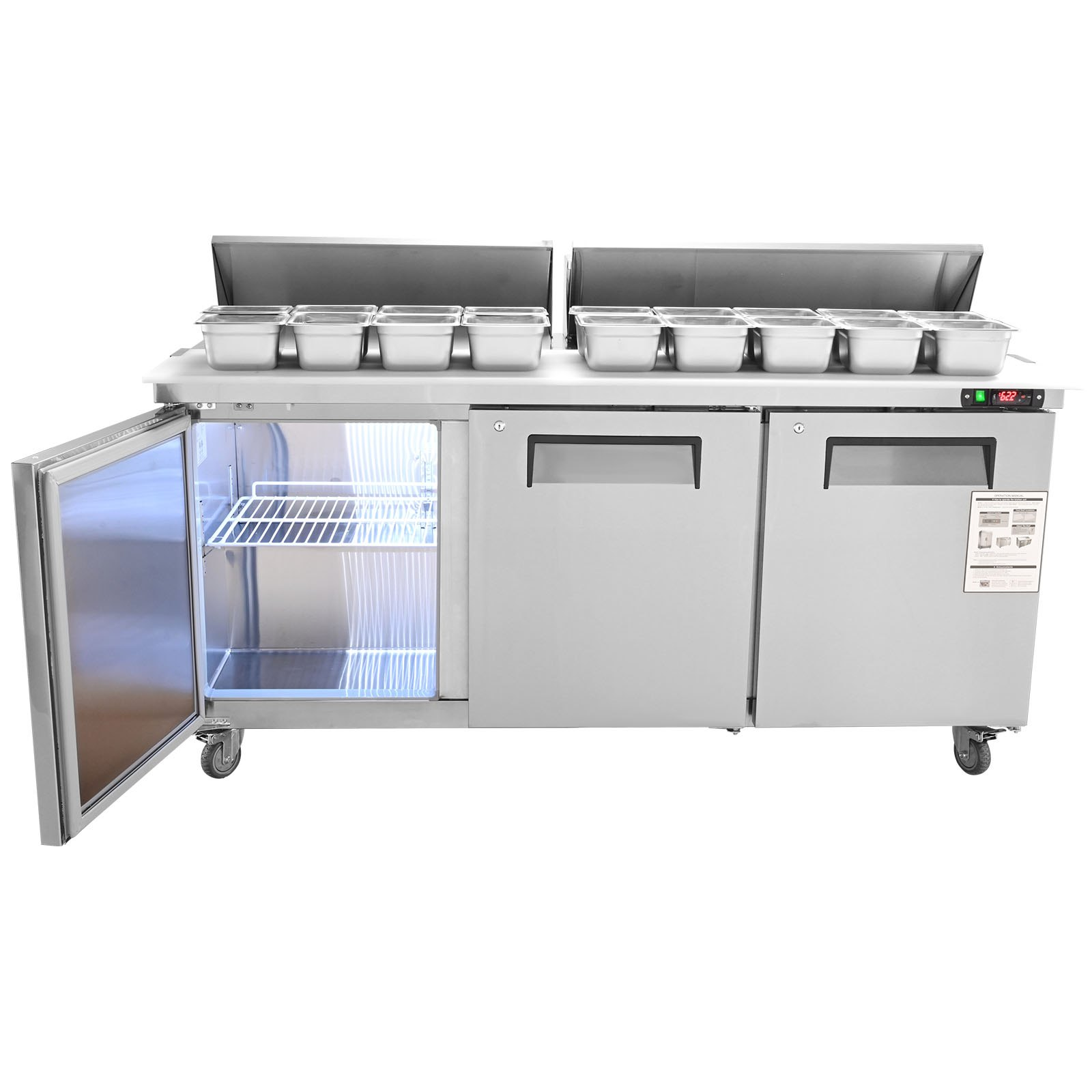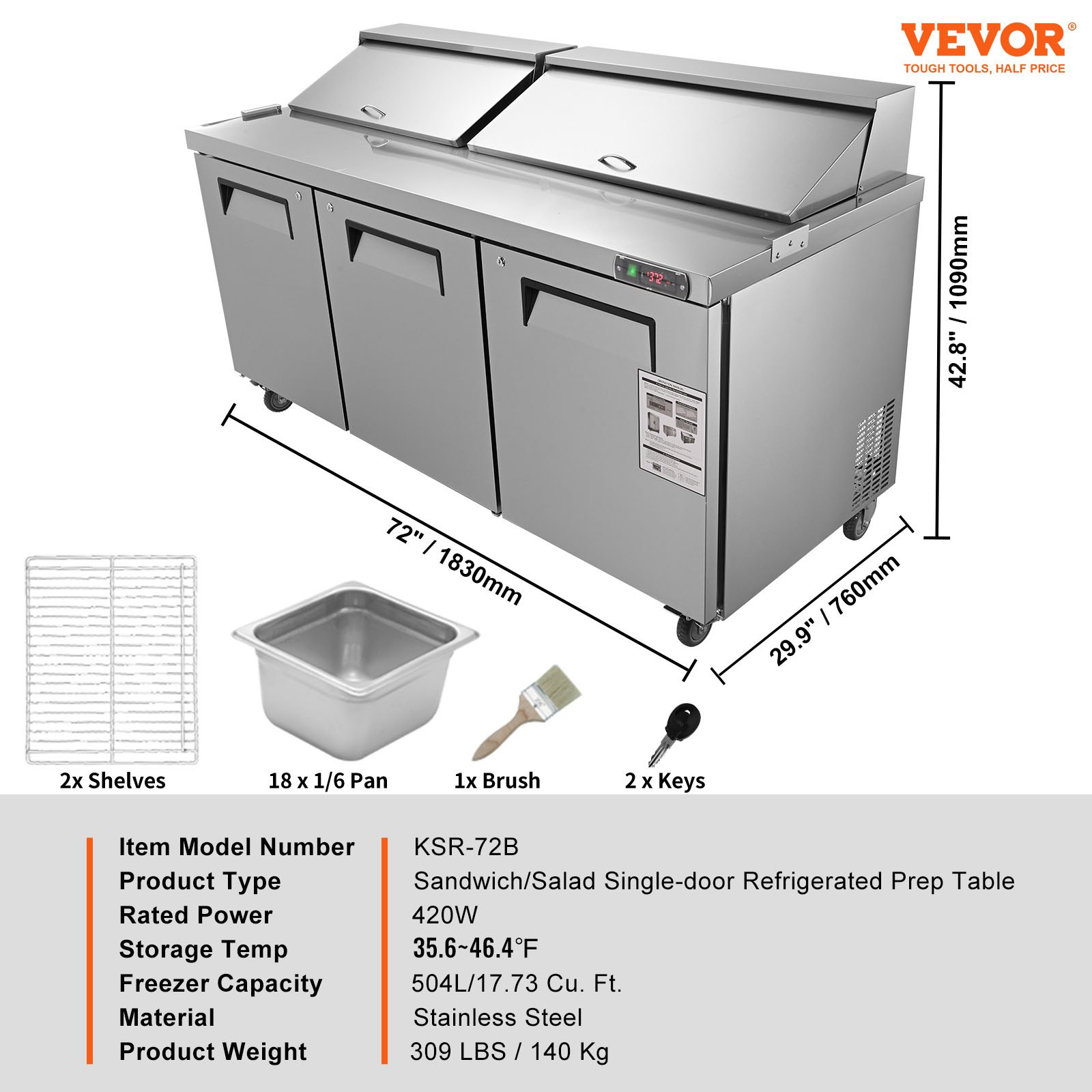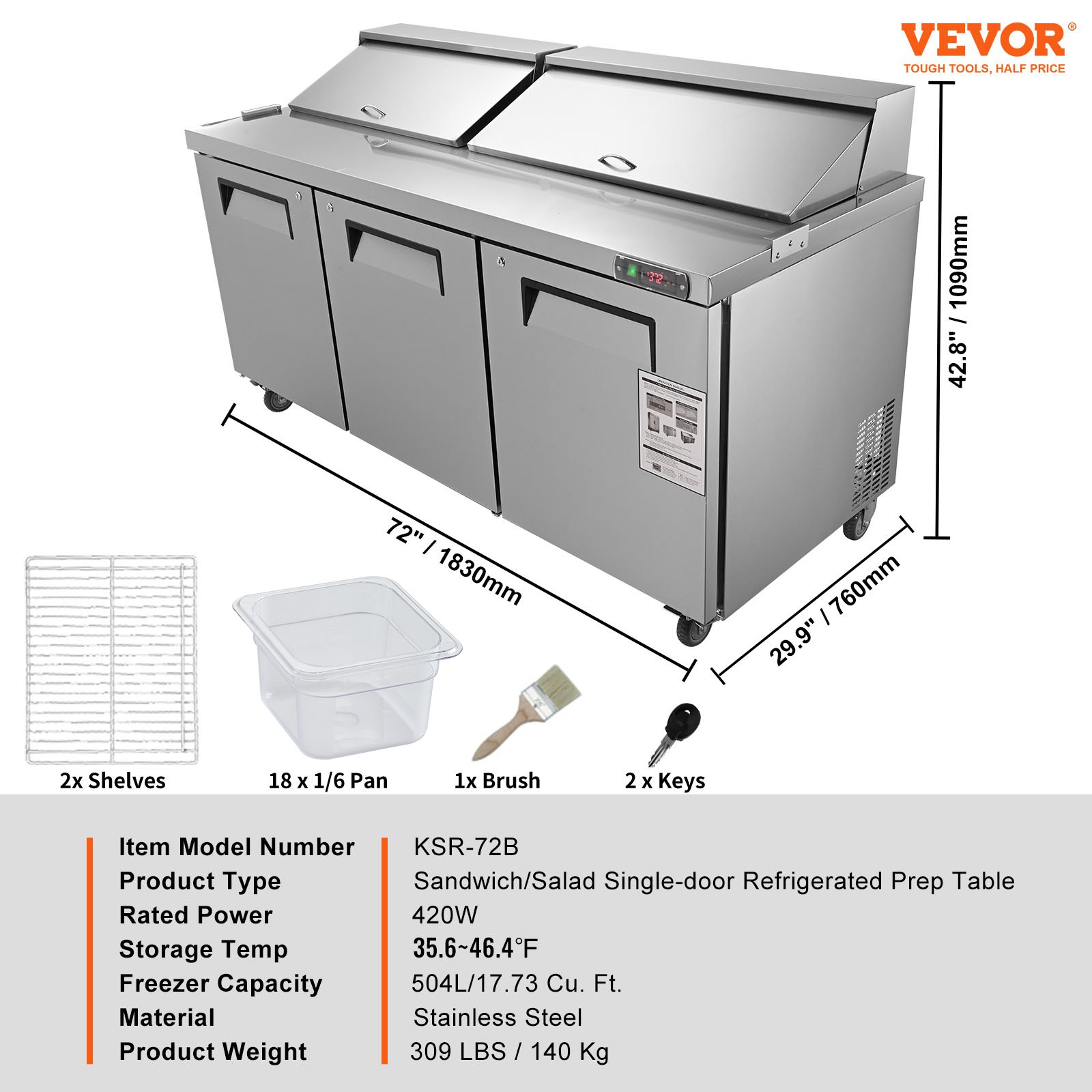 Freezer Capacity: 504L/17.73 Cu. Ft.,Product Type: Sandwich/Salad Triple-door Refrigerated Prep Table,Item Model Number: KSR-72B,Product Weight: 309 LBS / 140 Kg,Rated Power: 420W,Storage Temp: 35.6~46.4℉,Material: Stainless Steel,Cable Length: 82.7 in/ 2.1m,Voltage / Frequency: AC110-120V/60Hz,Product Size: 72 x 29.9 x 42.8 in / 1830 x 760 x 1090 mm