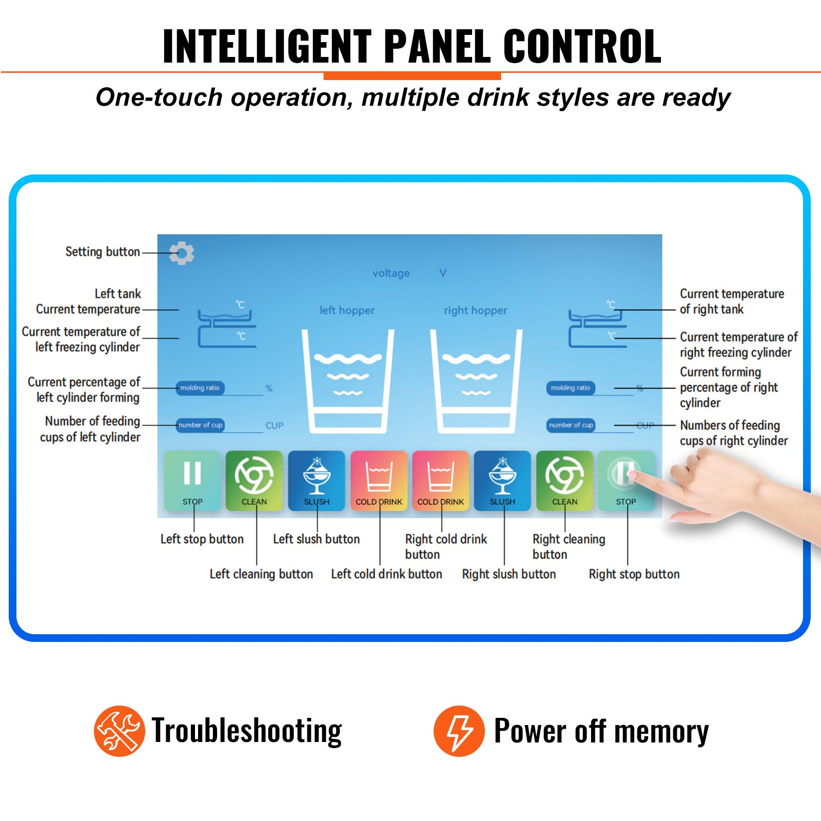 Capacity: 2 x 2.1 Gal / 2 x 8 L,Continuous Output: 26~32L/H slush; 15~21L/H alcohol,Refrigerant: R410,Voltage: AC120V 60Hz,Model: XRJF-21,Compressor Power: 1155W,Rated Power: 1800W,Material: 304 Stainless Steel + 201 Stainless Steel,Product Dimensions(L x W x H): 22.4 x 26.8 x 36.4 in / 570 × 680 × 925 mm,Net Weight: 207.2 lb / 94 kg