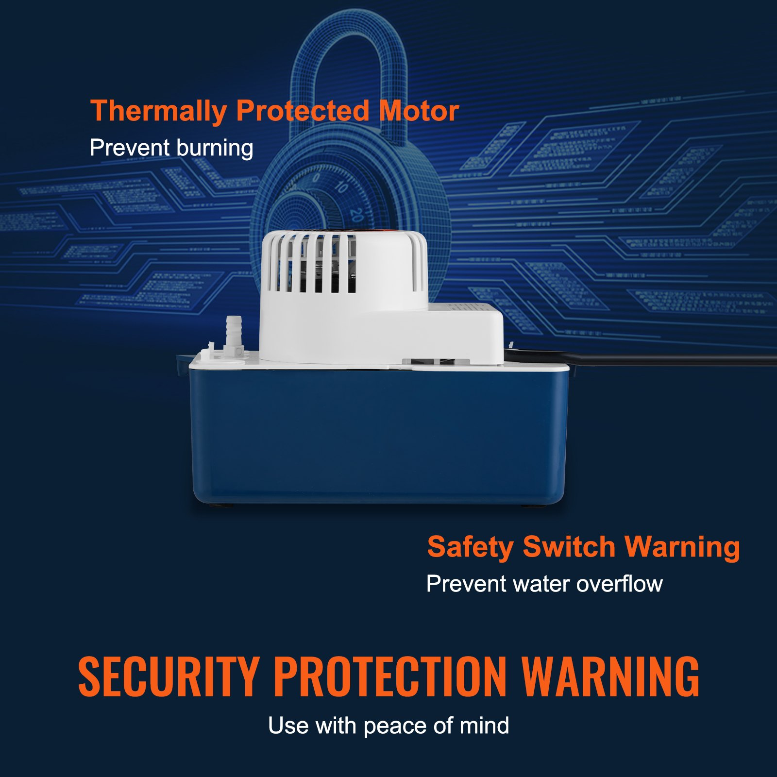 VEVOR Condensate Removal Pump, 1/50 HP, 65 GPH, 15 ft Lift, 115V Automatic AC Condensation Pump with Safety Switch & 20' Tubing for Air Conditioner, Dehumidifier, HVAC, Furnace, Ice Maker Water Drain
