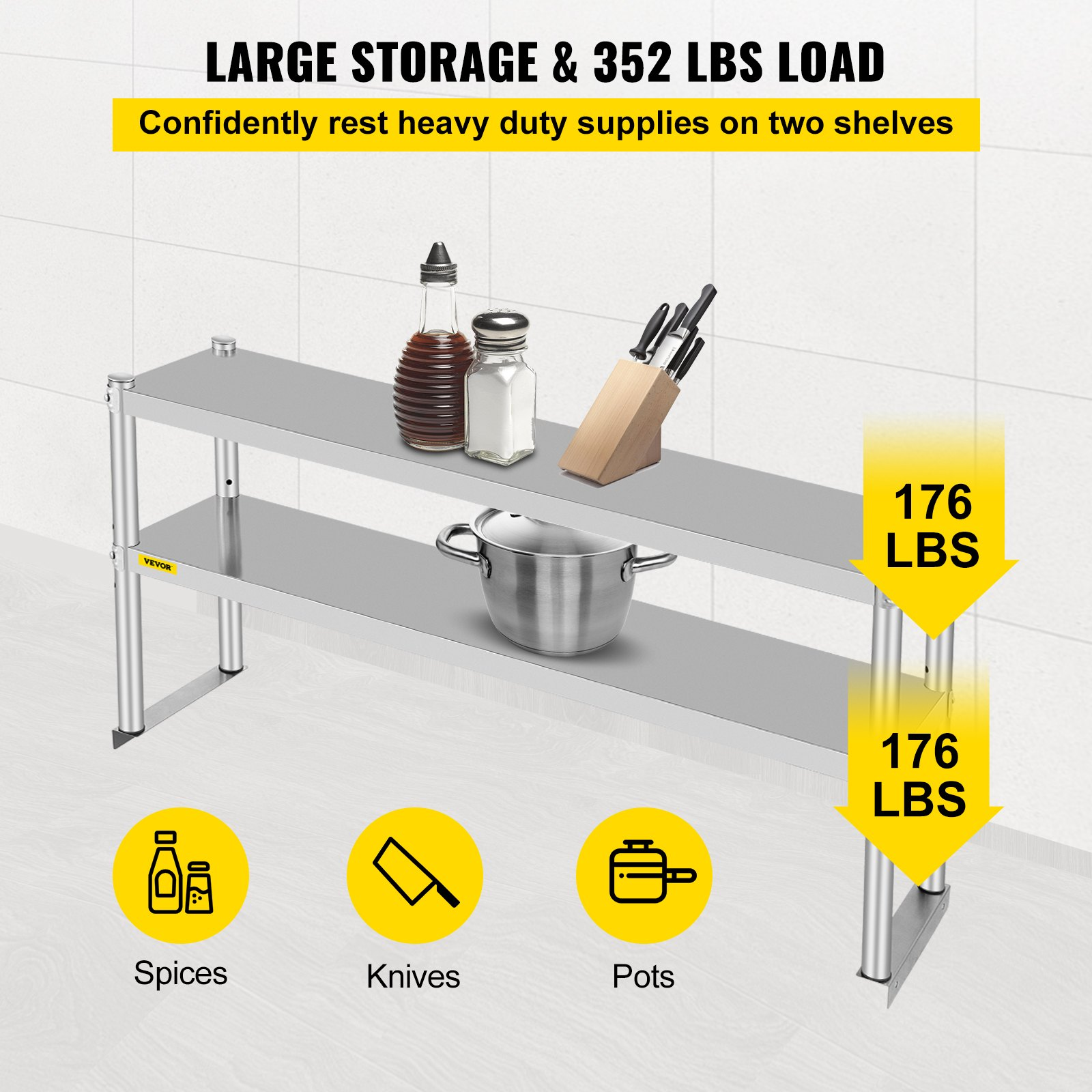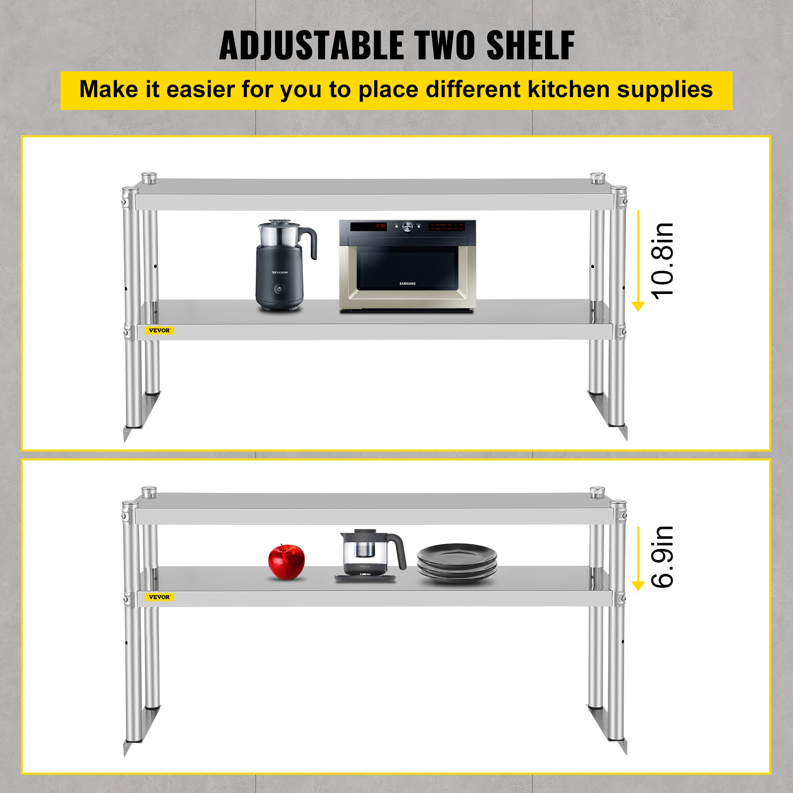 VEVOR Double Overshelf, Double Tier Stainless Steel Overshelf, 48 x 12 x 24 in Double Deck Overshelf, Height Adjustable Overshelf for Prep & Work Table in Kitchen, Restaurant