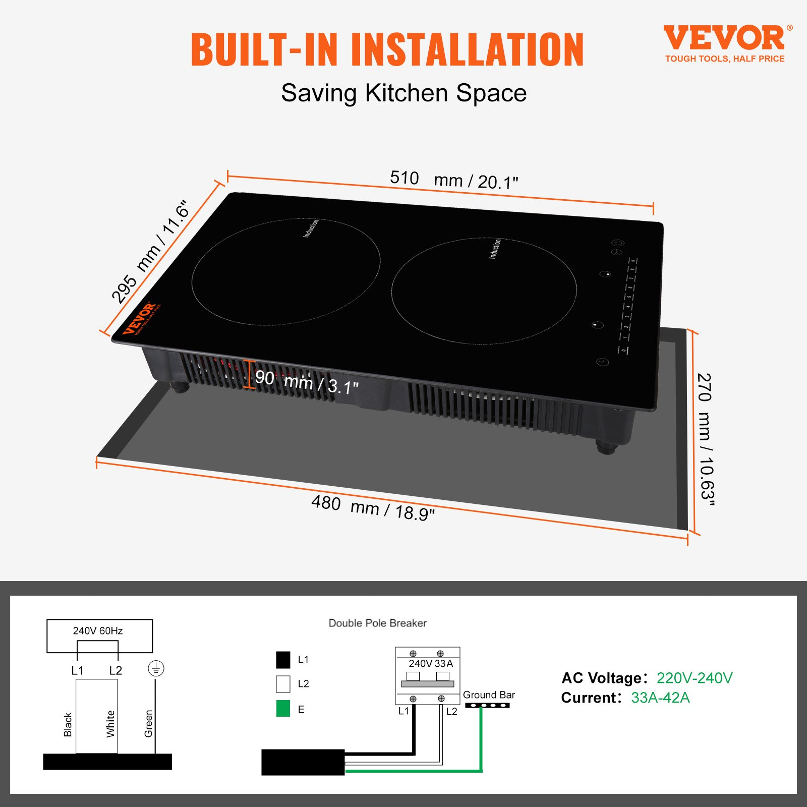 VEVOR Electric Cooktop, 2 Burners, 12'' Induction Stove Top, Built-in Magnetic Cooktop 1800W, 9 Heating Level Multifunctional Burner, LED Touch Screen w/ Child Lock & Over-Temperature Protection