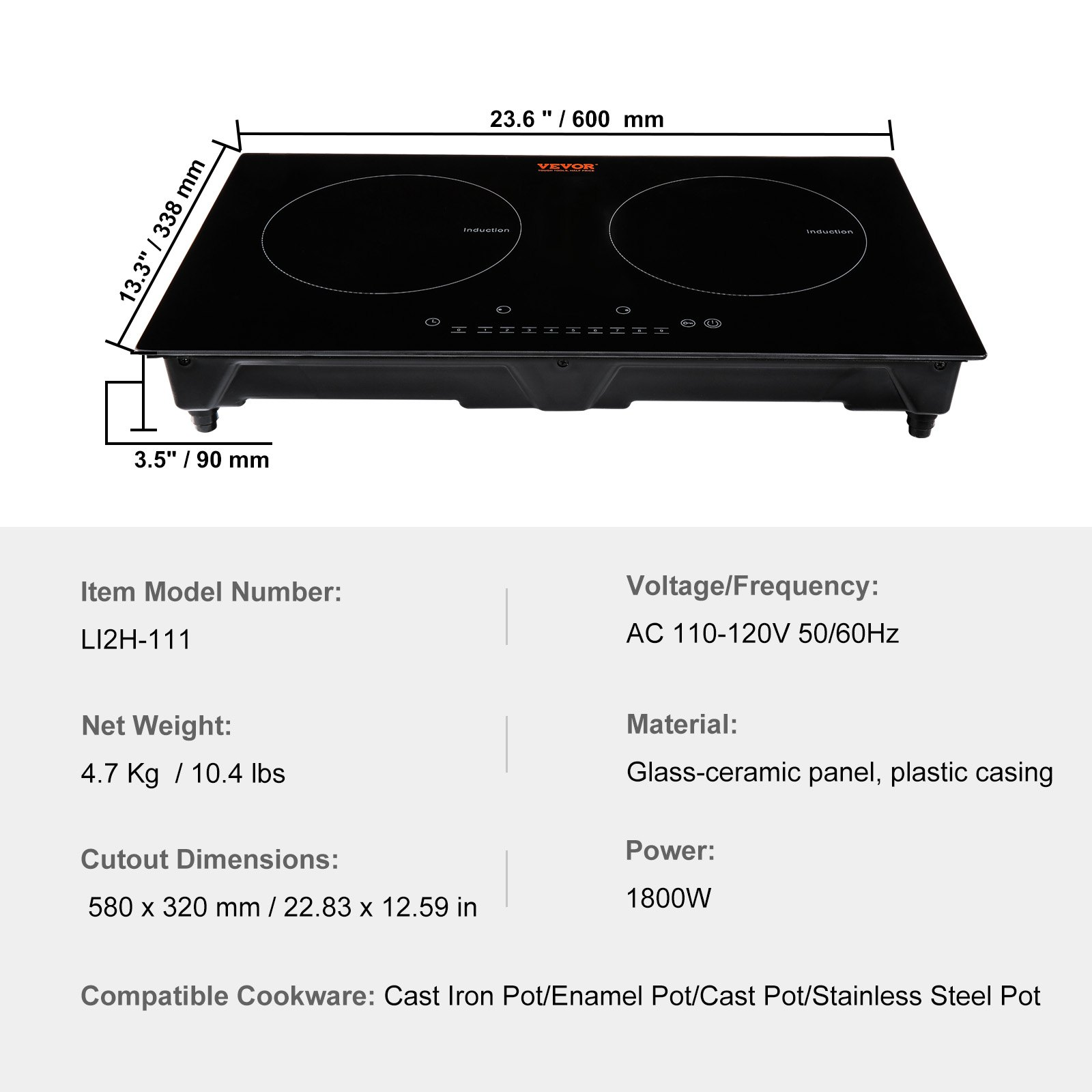 Voltage/Frequency: AC 110-120V 50/60Hz,Model: LI2H-111,Compatible Cookware: Iron Pot/Cast Iron Pot/Stainless Steel Pot,Material: Vitroceramic Glass, Metal Casing,Net Weight: 4.7 Kg / 10.4 lbs,Power: 1800W,Gear Position: 9
