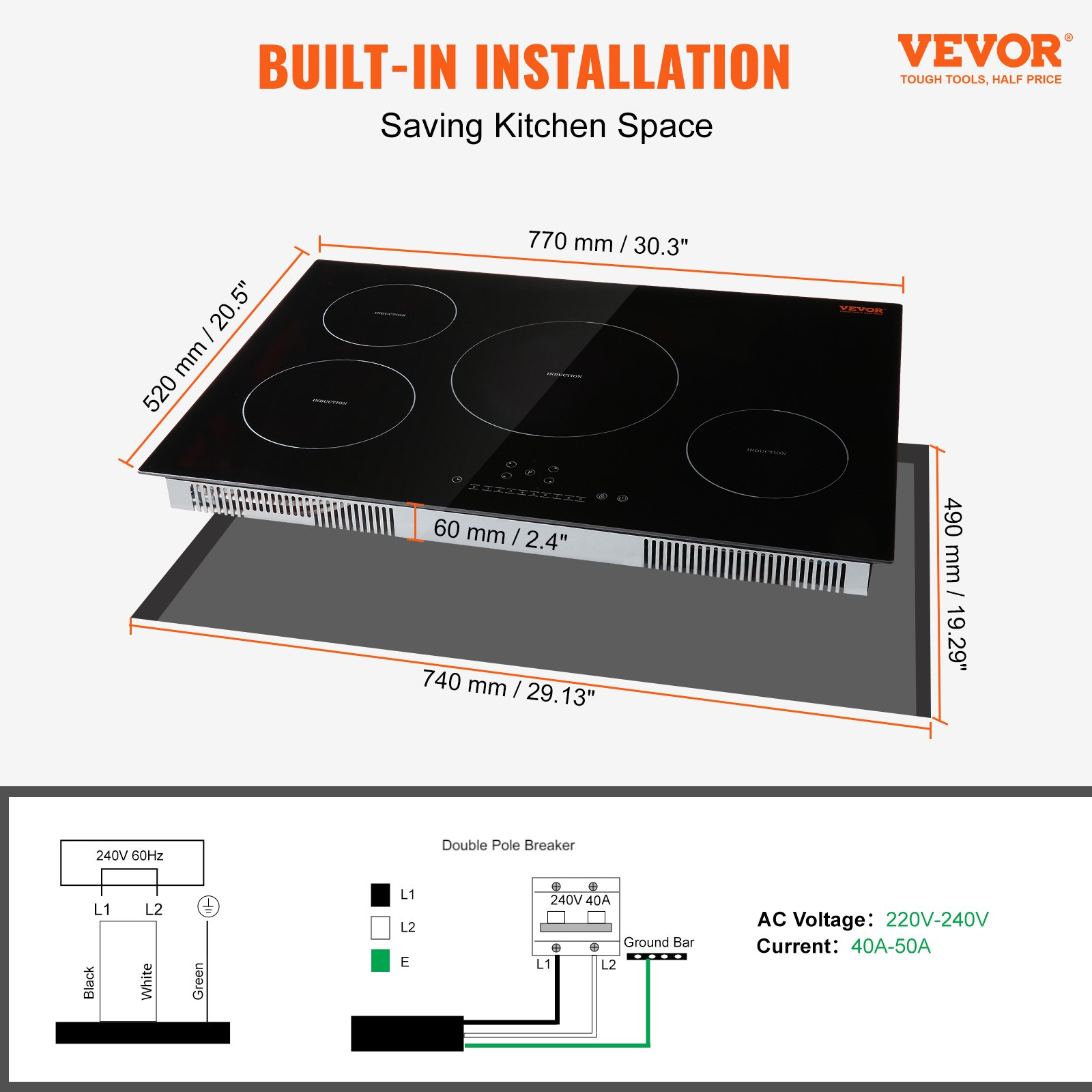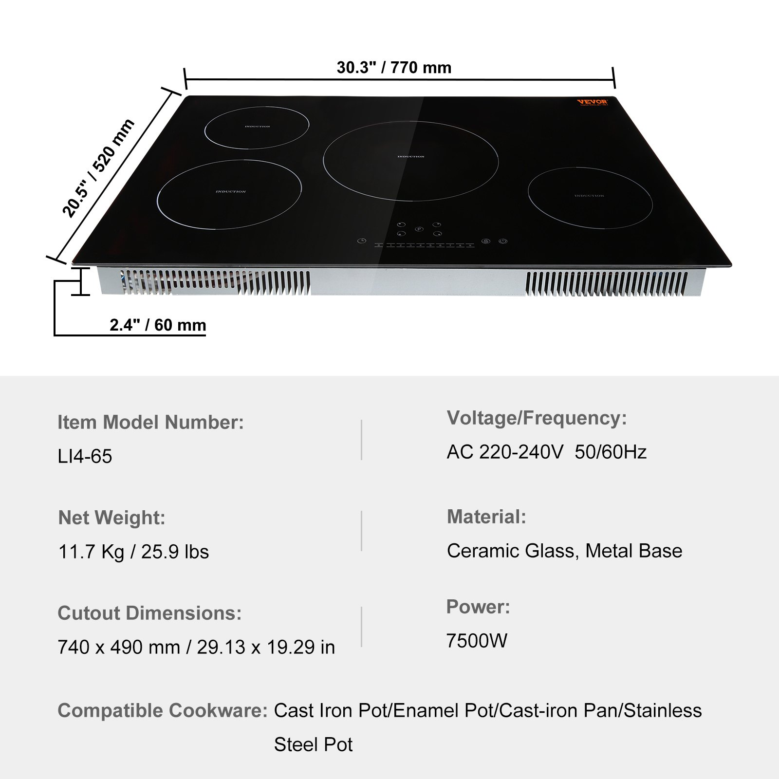 Voltage/Frequency: 220-240V, 50/60Hz,Model: LI4-65,Compatible Cookware: Cast Iron Pot, Cast Aluminum Pot, Stainless Steel Pot,Material: Tempered Glass Panel, Metal Bottom Shell,Net Weight: 11.7 Kg / 25.9 lbs,Power: 7500W